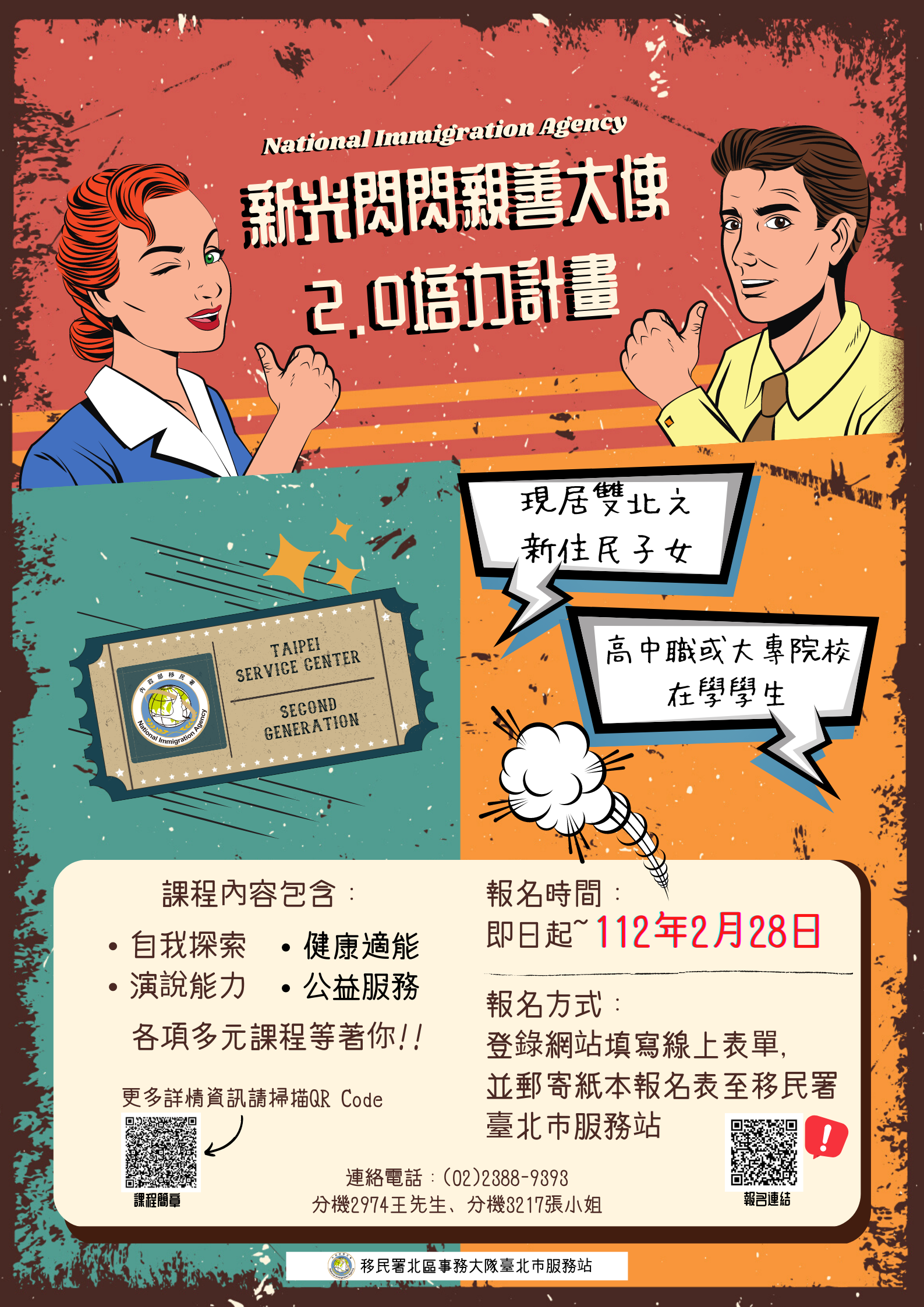 二、旨揭計畫係為徵選現就讀本市高中職及大專院校之新住民二代學生,成立新光閃閃親善大使團並安排免費培訓課程,報名期間自即日起至112年2月28日(星期二)止,報 名採線上及紙本同步寄送方式,詳情請瀏覽臺北市服務站 官網課程訊息連結