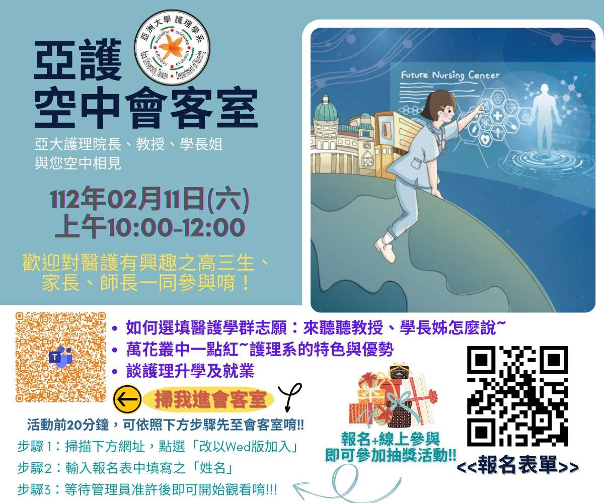 一、為提升高中生對醫護學群之認識,本校護理學系特別規劃 「亞護空中會客室」直播互動節目,希望透過此活動,使 高中生能更清楚了解白衣天使的專業特色與優勢。
