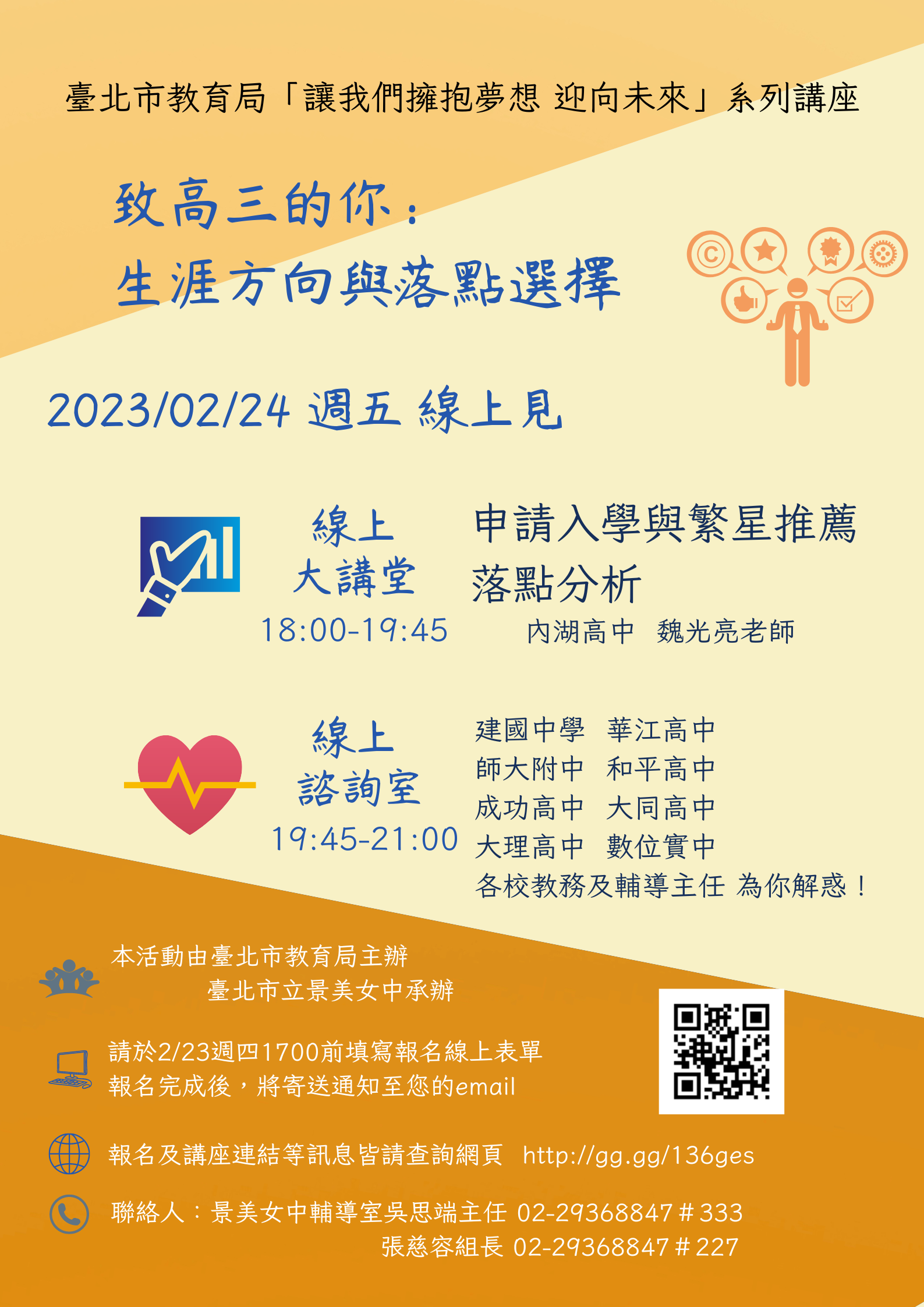 (二)線上大講堂及線上諮詢室活動網址,將於112年2月23日(星期四)公告於景美女中校網本活動相關訊息,網址