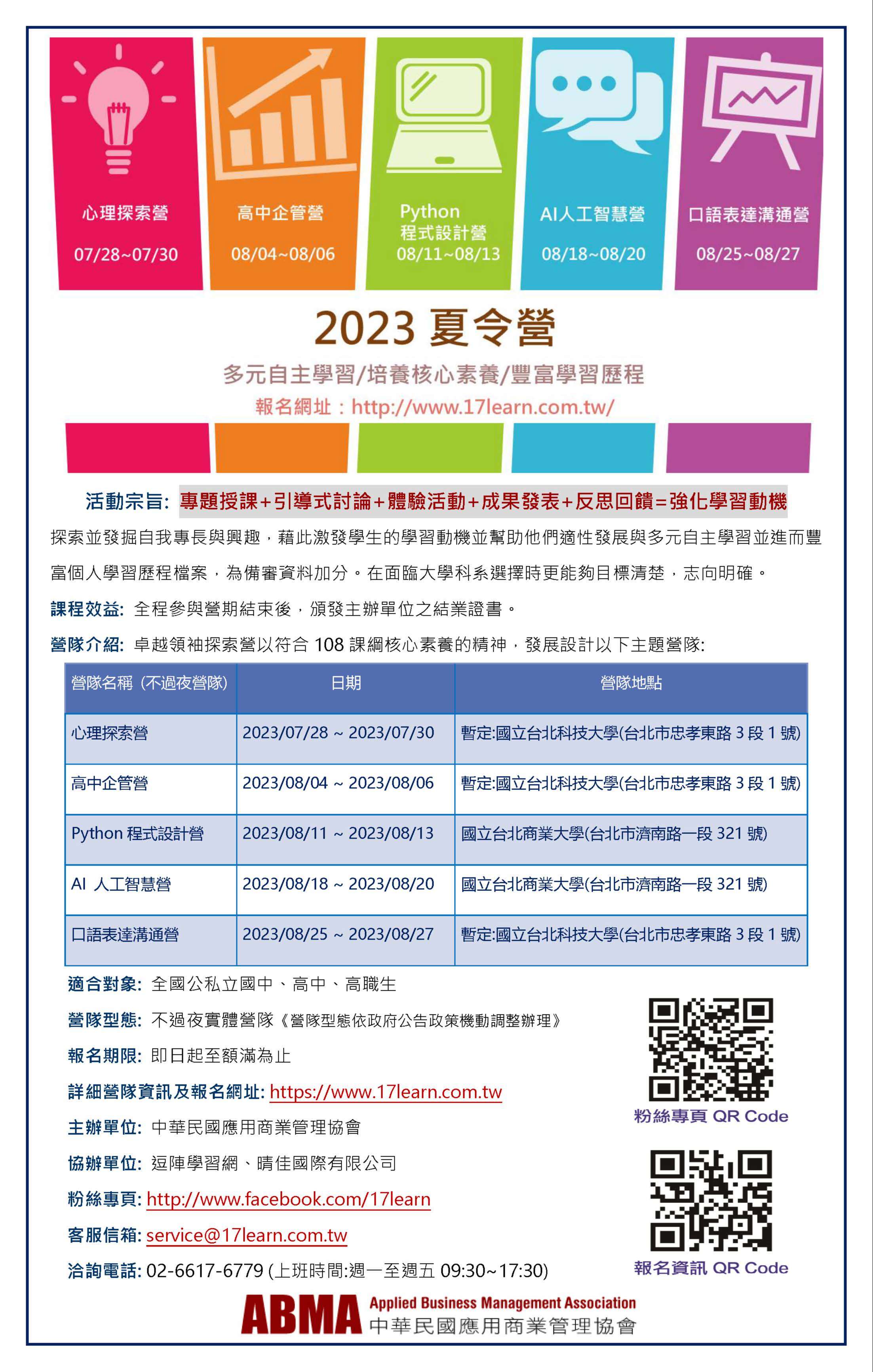 九、更多營隊訊息及報名網址:請點此或請來信課程服務中心洽詢:service@17learn.com.tw