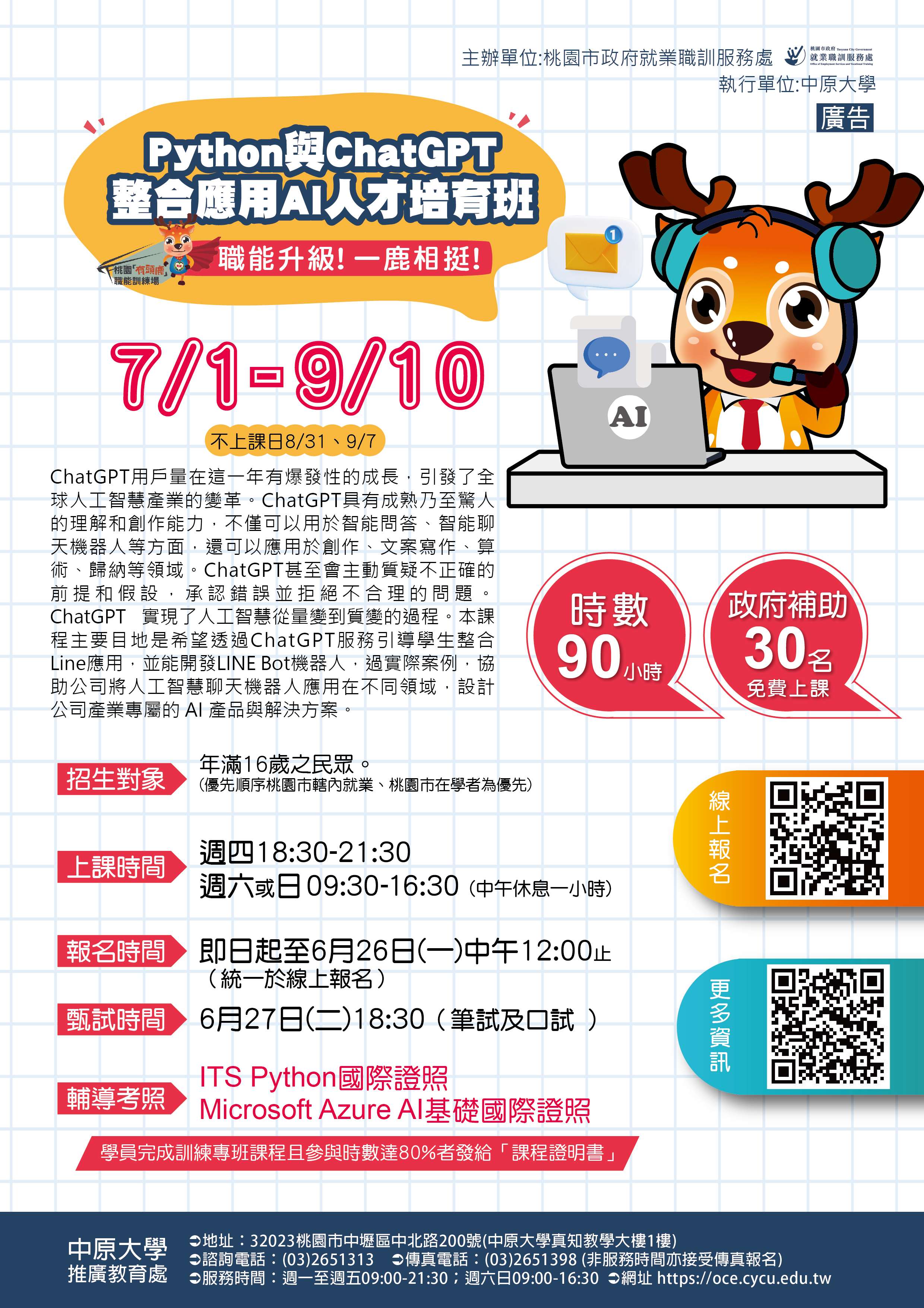 六、旨揭訓練課程資訊請至本校推廣教育處網站查閱 (請點此),洽詢電話:03-2651313服務專員。