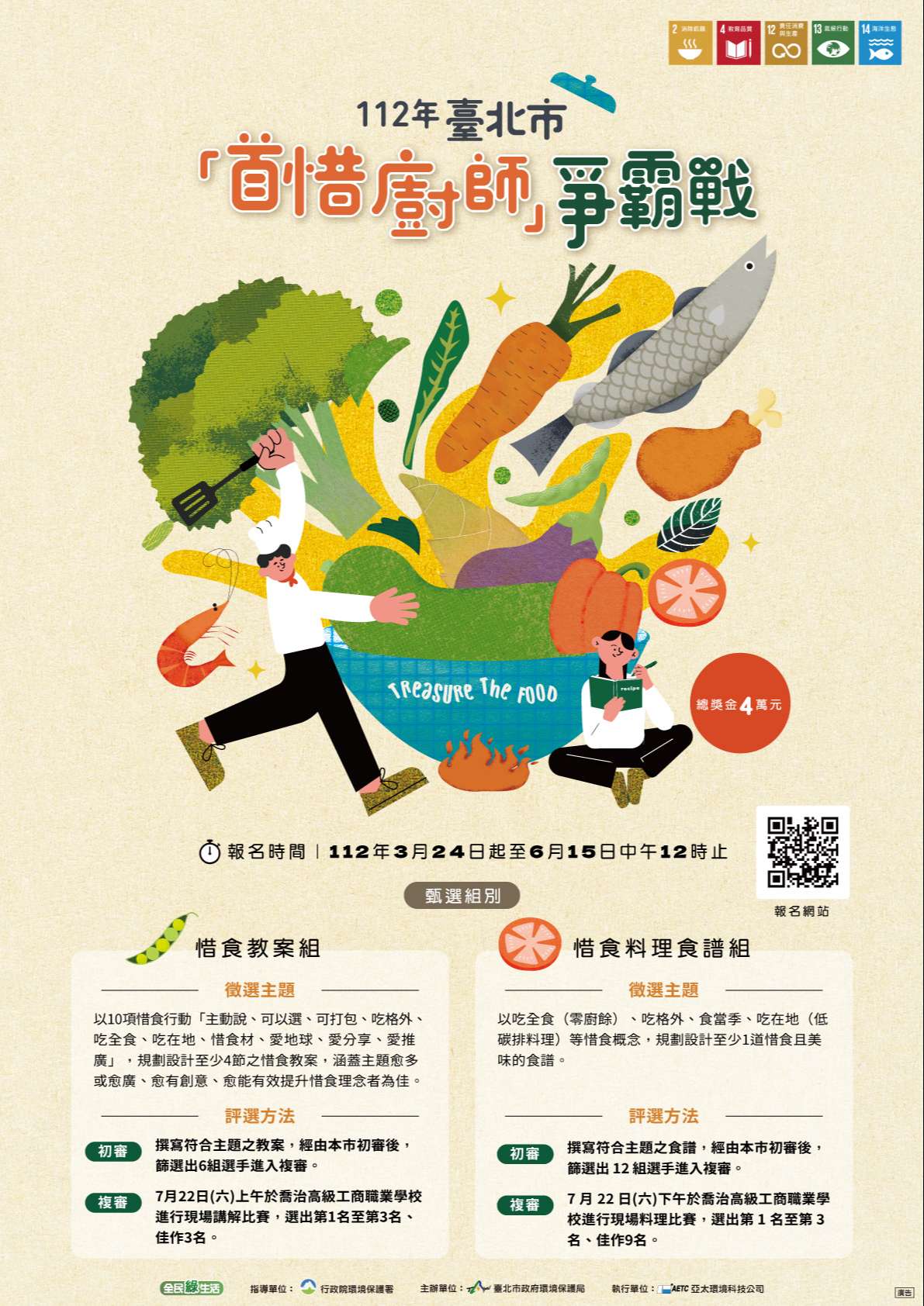 主旨:檢送臺北市政府環境保護局辦理112年臺北市「首惜」廚師爭霸戰活動簡章及海報各1份,請師生踴躍參加,請查照。