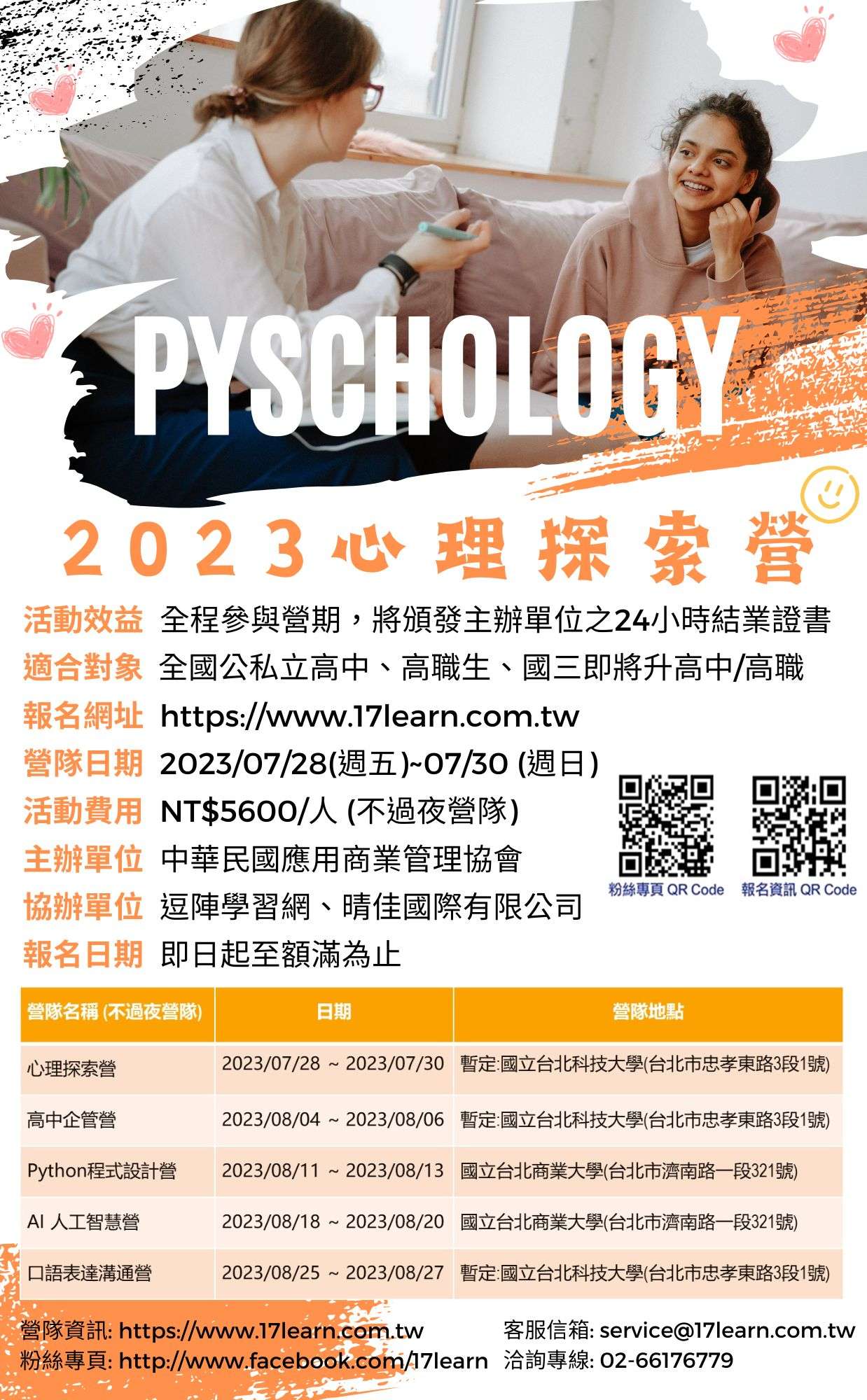 九、另有多項營隊:高中企管營、Python程式設計營、AI人工智慧營、口語表達溝通營,歡迎報名參加。