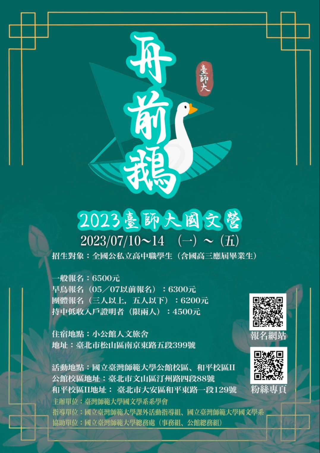 三、本營隊所開設之課程除由本校國文學系教授授課外,另邀 請國內著名專家學者授課,詳細資料請見網站:2023臺師大國文營《舟前鵝》FB粉絲專頁或IG粉絲帳號: @ch2023_camp 。