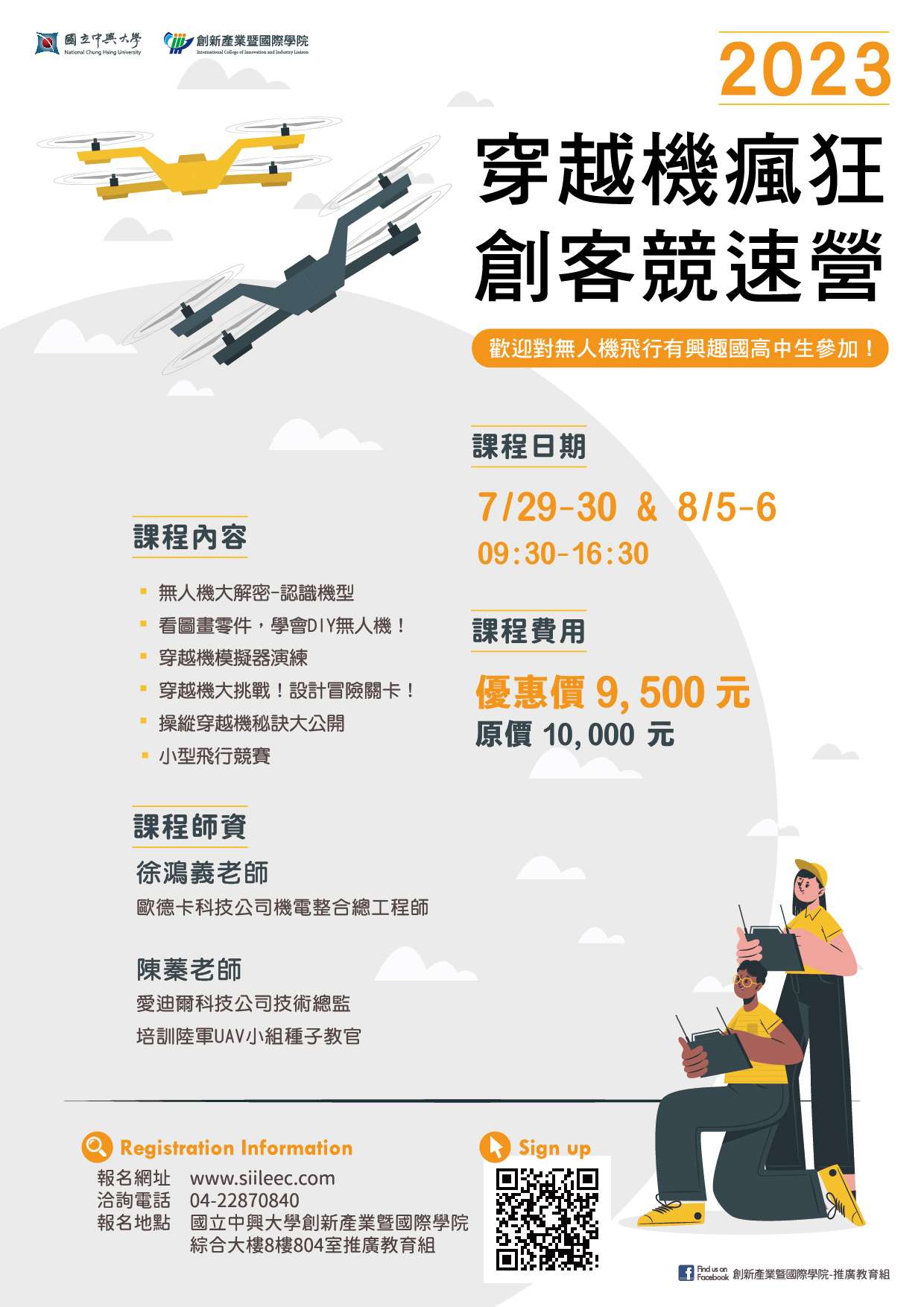 三、營隊資訊如下: (一)鑑識推理日期︰2023年7月12日至7月14日。 (二)穿越機瘋狂創客日期︰2023年7月29日至30日、及8月5日 至6日。 (三)地點:國立中興大學綜合大樓教室。 (四)費用請參卓報名網站資訊。5.報名方式:請至本校創產 學院線上報名系統報名(請點此)。至「國立中興大學創新 產業暨國際學院線上報名繳費系統」,點選「國高中生 研習」加入會員即可報名。