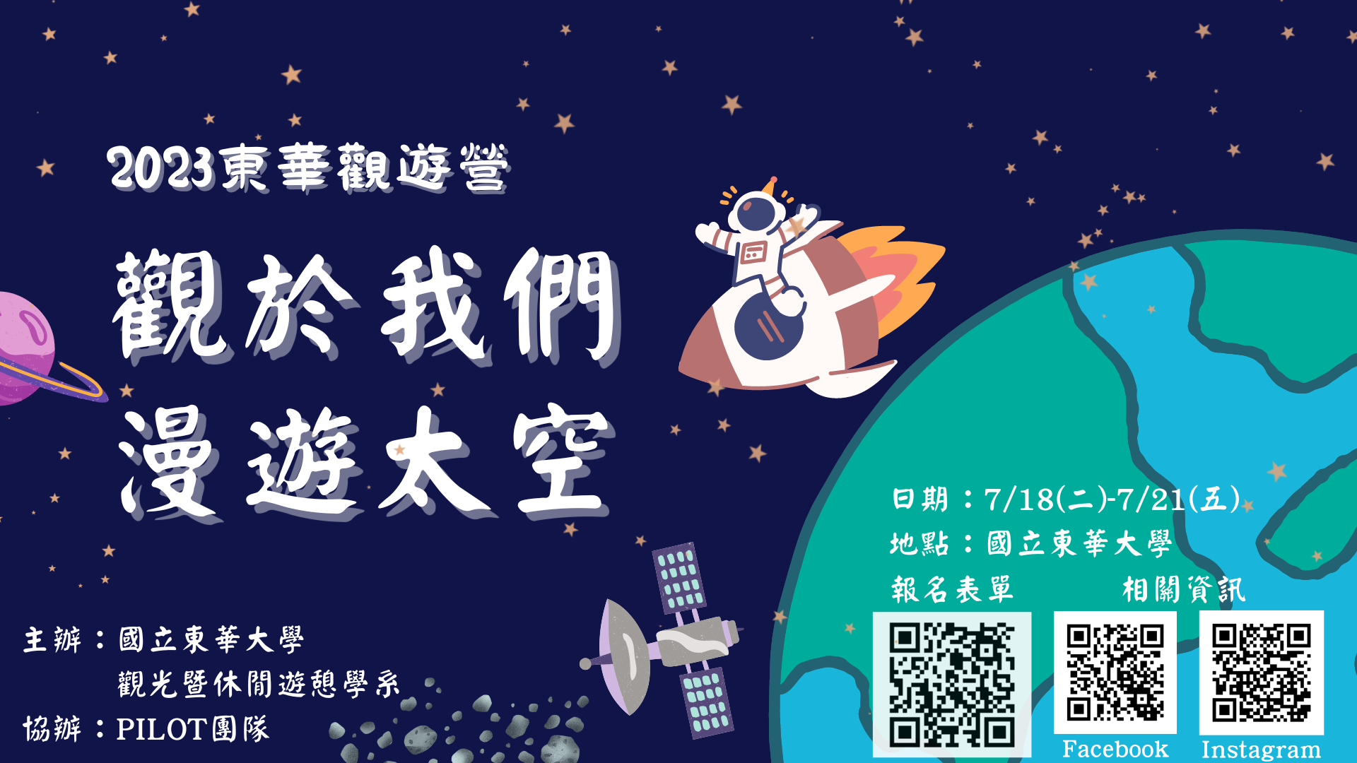 二、活動特色:內容包含企業參訪、遊程競賽、體驗課程、師 長主題授課及學長姊經驗分享,為一具層次性的營隊,結 合花蓮知名企業、豐富生態環境、東華大學美麗校園及觀 遊系優勢與特色,帶領高中生進行一場寓教於樂、關懷資 源永續的深度遊憩體驗。
