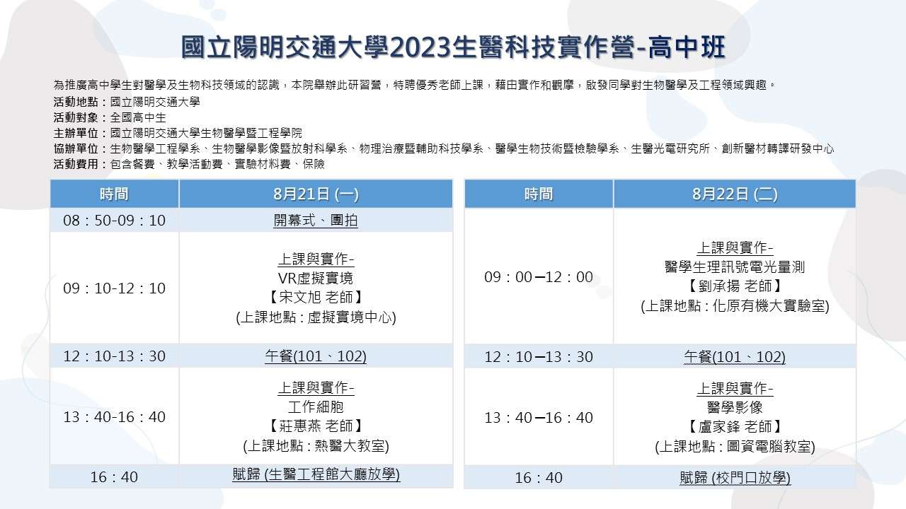 三、檢送「2023生醫科技實作營」招生海報及課程規劃,敬請 惠予協助公告宣傳,並鼓勵同學報名參加。