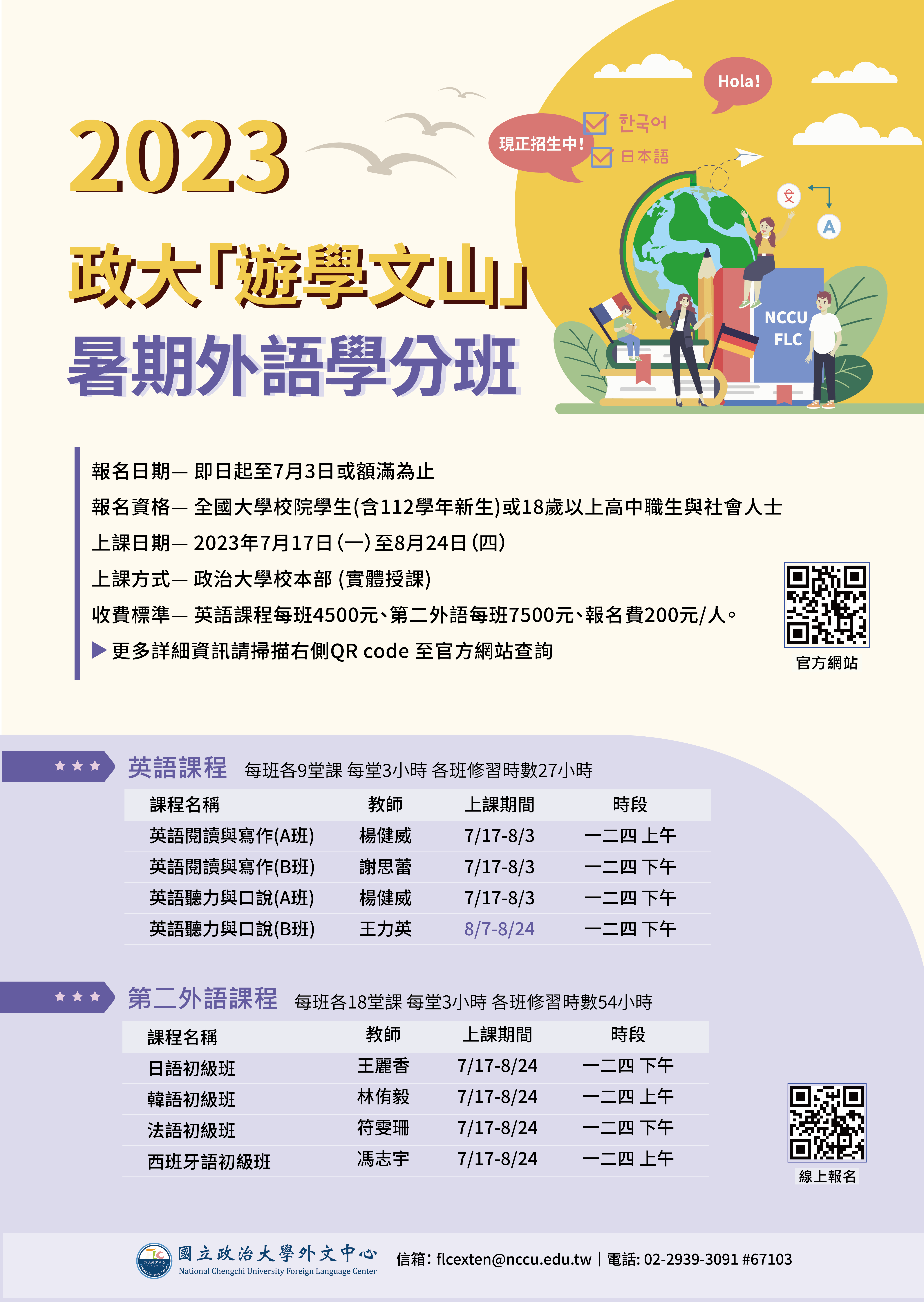 八、檢附2023年政大遊學文山暑期外語學分班海報供參。