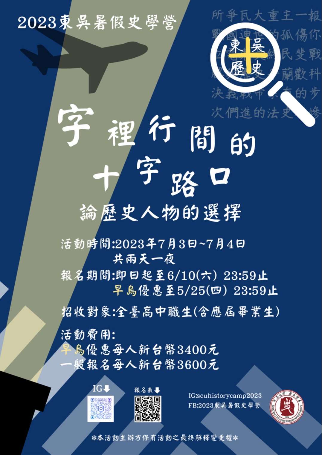 一、本校歷史學系為提供高中生親近歷史學與發掘自我興趣的 管道,訂於民國112年7月3日(星期一)至7月4日(星期 二),在東吳大學外雙溪校區辦理「2023東吳暑假史學營 《字裡行間的十字路口》」,活動海報如附,敬請協助公 告,並鼓勵所屬踴躍報名參加。