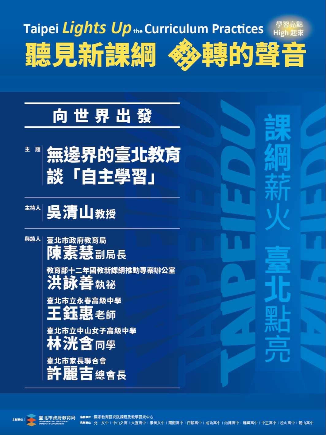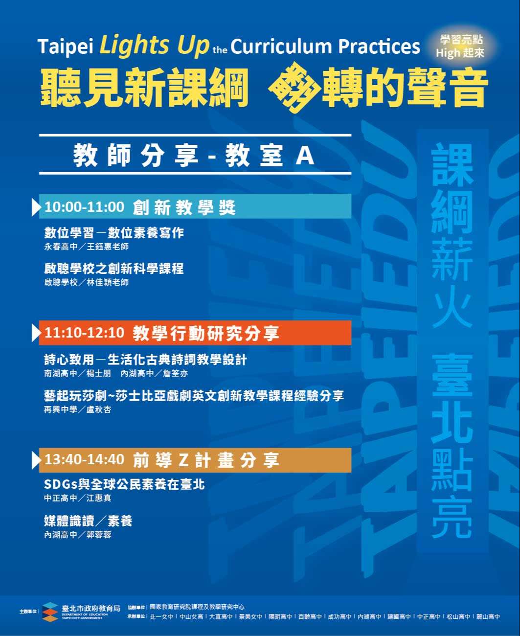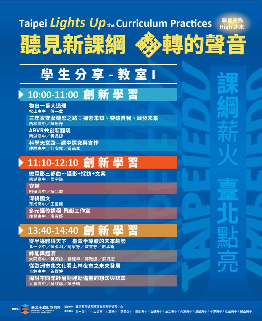 (三)活動內容:30組教師教學經驗分享、60組學生學習歷程 檔案分享及2場主題論壇【亮點臺北教育高峰論壇 聽見 新課綱翻轉的聲音】、【向世界出發 無邊界的臺北教 育】。