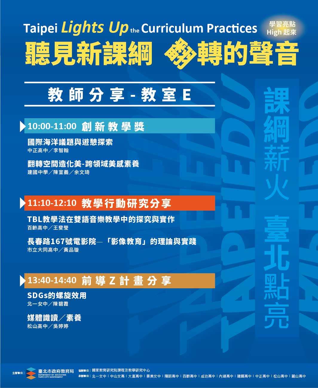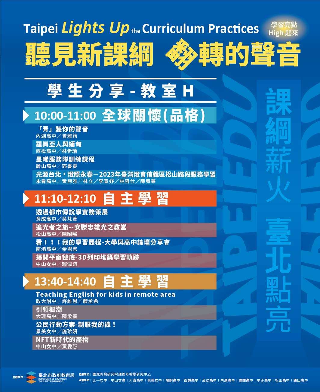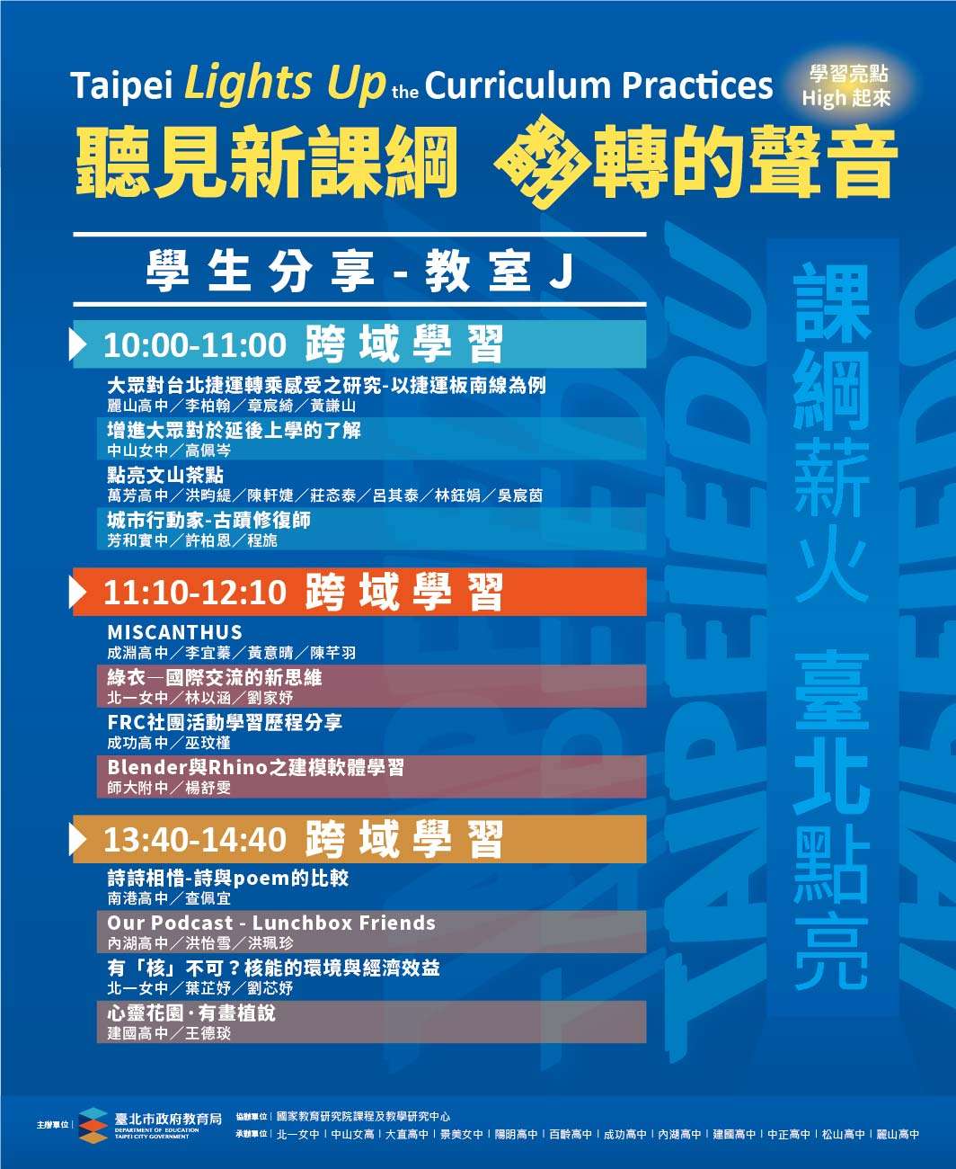 (三)活動內容:30組教師教學經驗分享、60組學生學習歷程 檔案分享及2場主題論壇【亮點臺北教育高峰論壇 聽見 新課綱翻轉的聲音】、【向世界出發 無邊界的臺北教 育】。