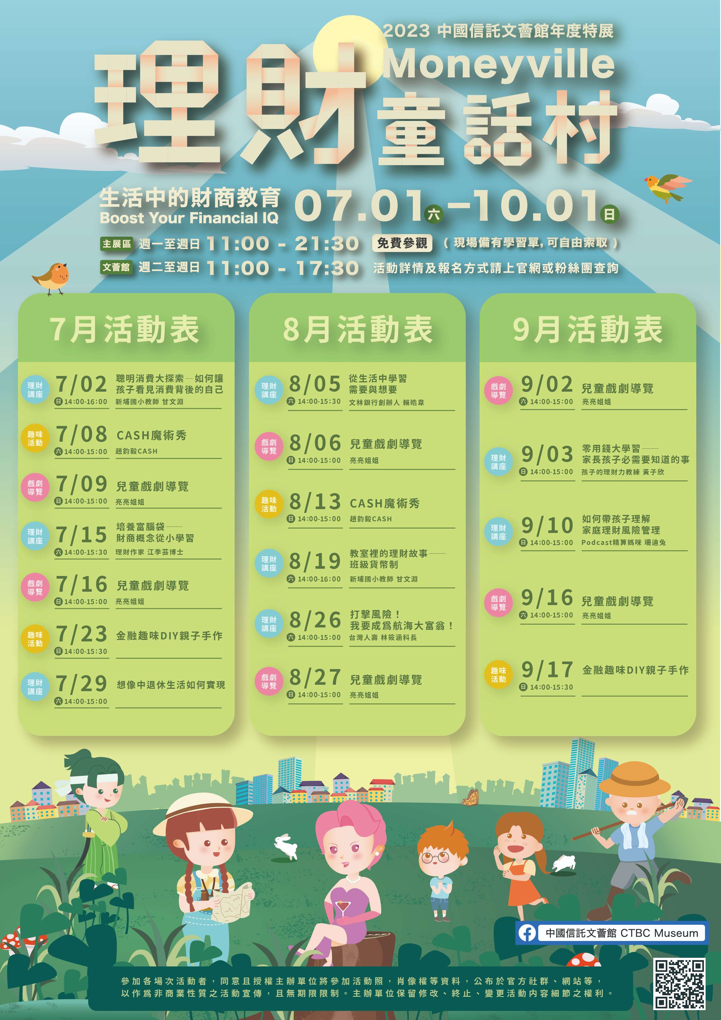 (三)特展簡介:打造繪本故事風格的展場,探討生活中可能會遇到的金融問題及應該如何因應。展區依「存款與緊急預備金、錢從哪裡來?認識金融機構」、「目標儲蓄與消費、需要與想要、記帳」、「支付方式、投資理財與風險」、「比價節流、借貸、斜槓開源」、「生活中必要的保險」等五個主題,切入貼近生活的財商觀念,
