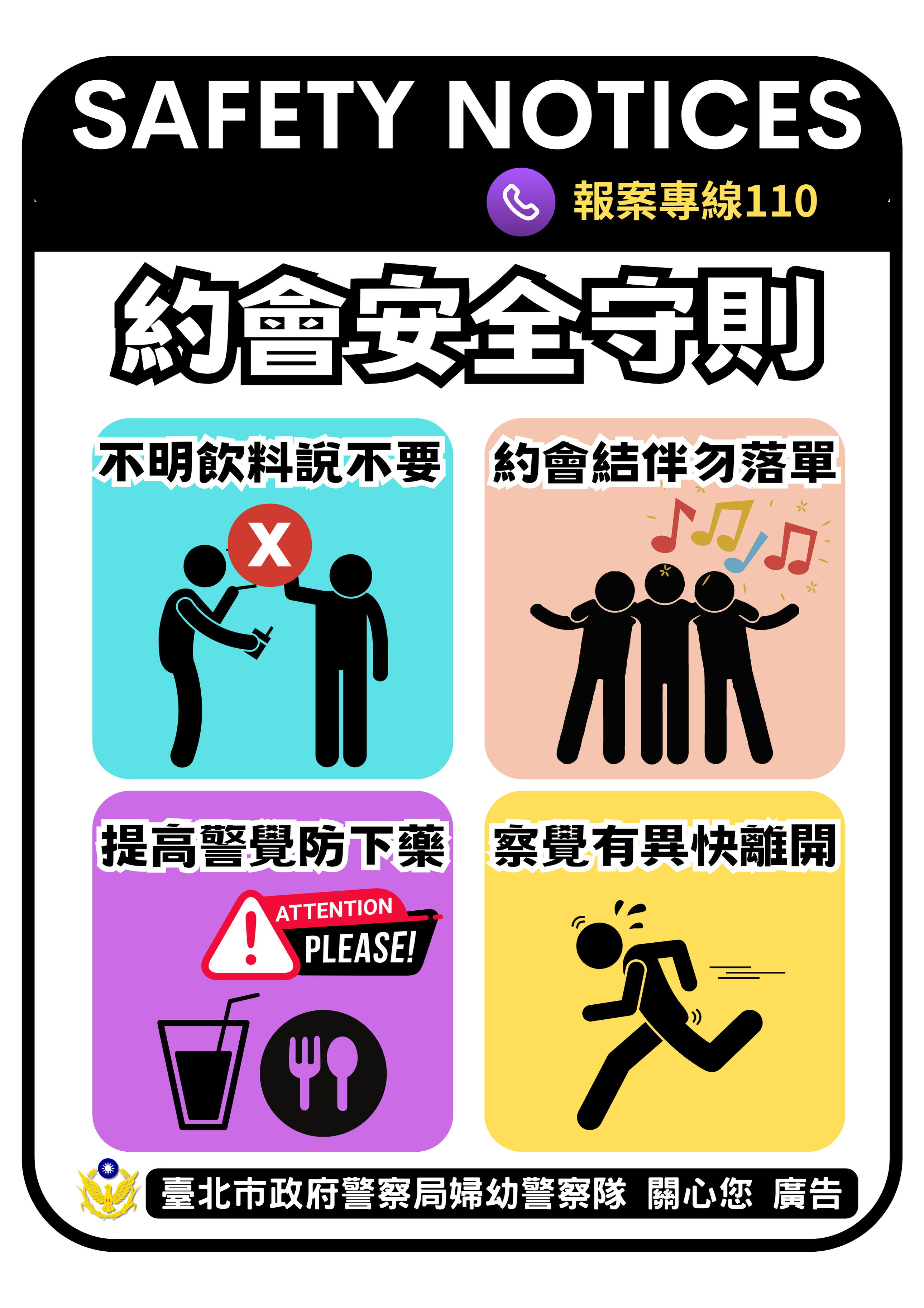 2.出入公共場所也請注意來歷不明的飲料,勿飲已離開視線範圍的飲料。