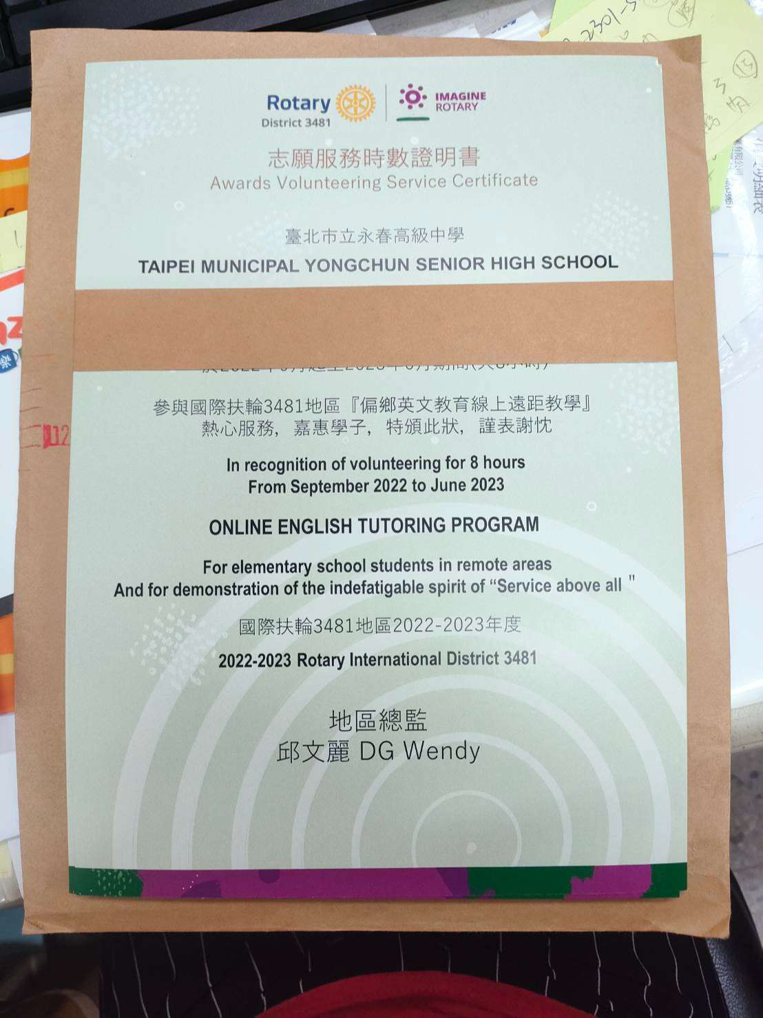 扶輪社也有頒發一張給各位,請各位盡速至教務處實研組領取。