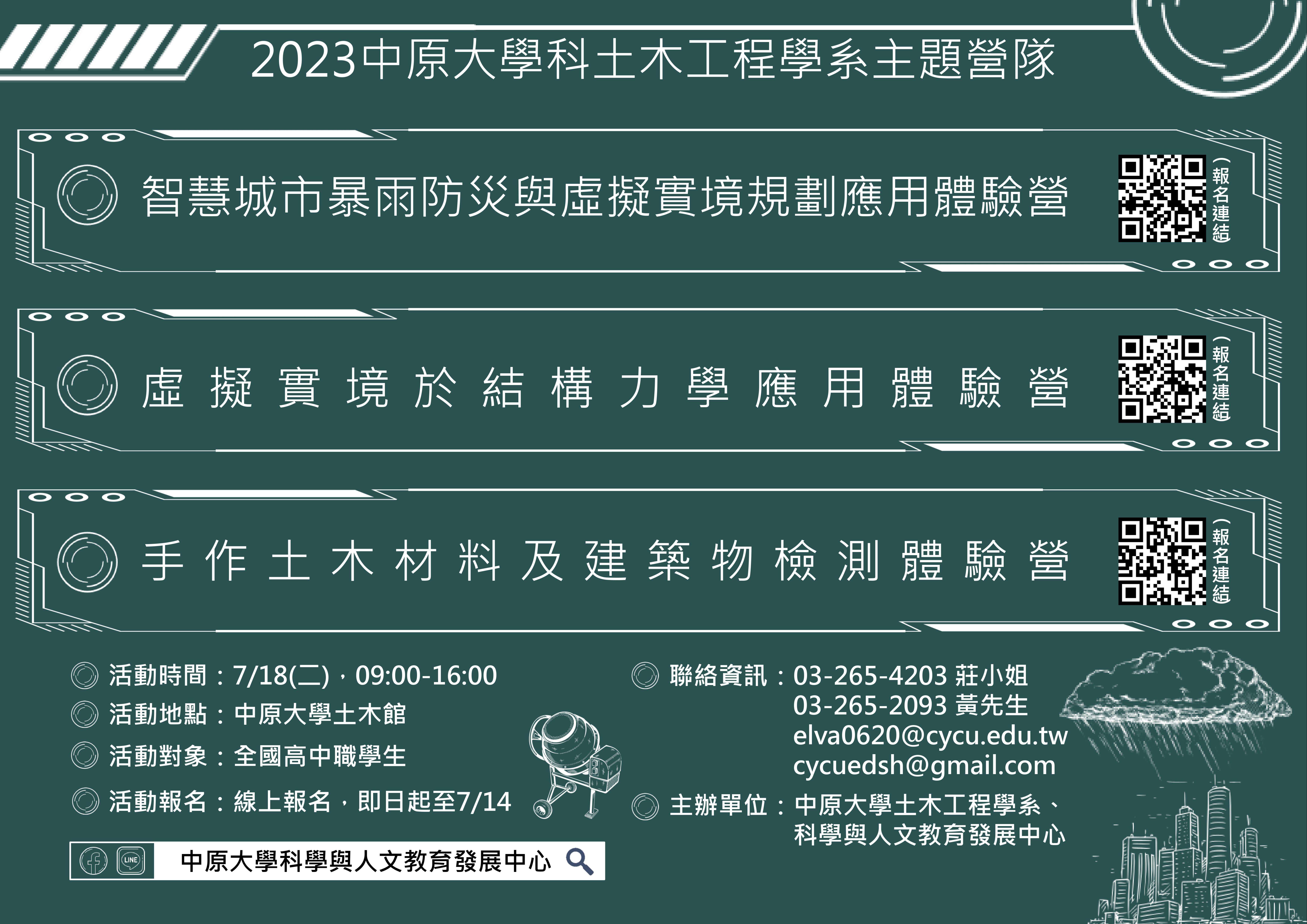 (一)活動內容: 1、主題一:智慧城市暴雨防災與虛擬實境規劃應用體驗 營。 2、主題二:虛擬實境於結構力學應用體驗營。 3、主題三:手作土木材料及建築物檢測體驗營。