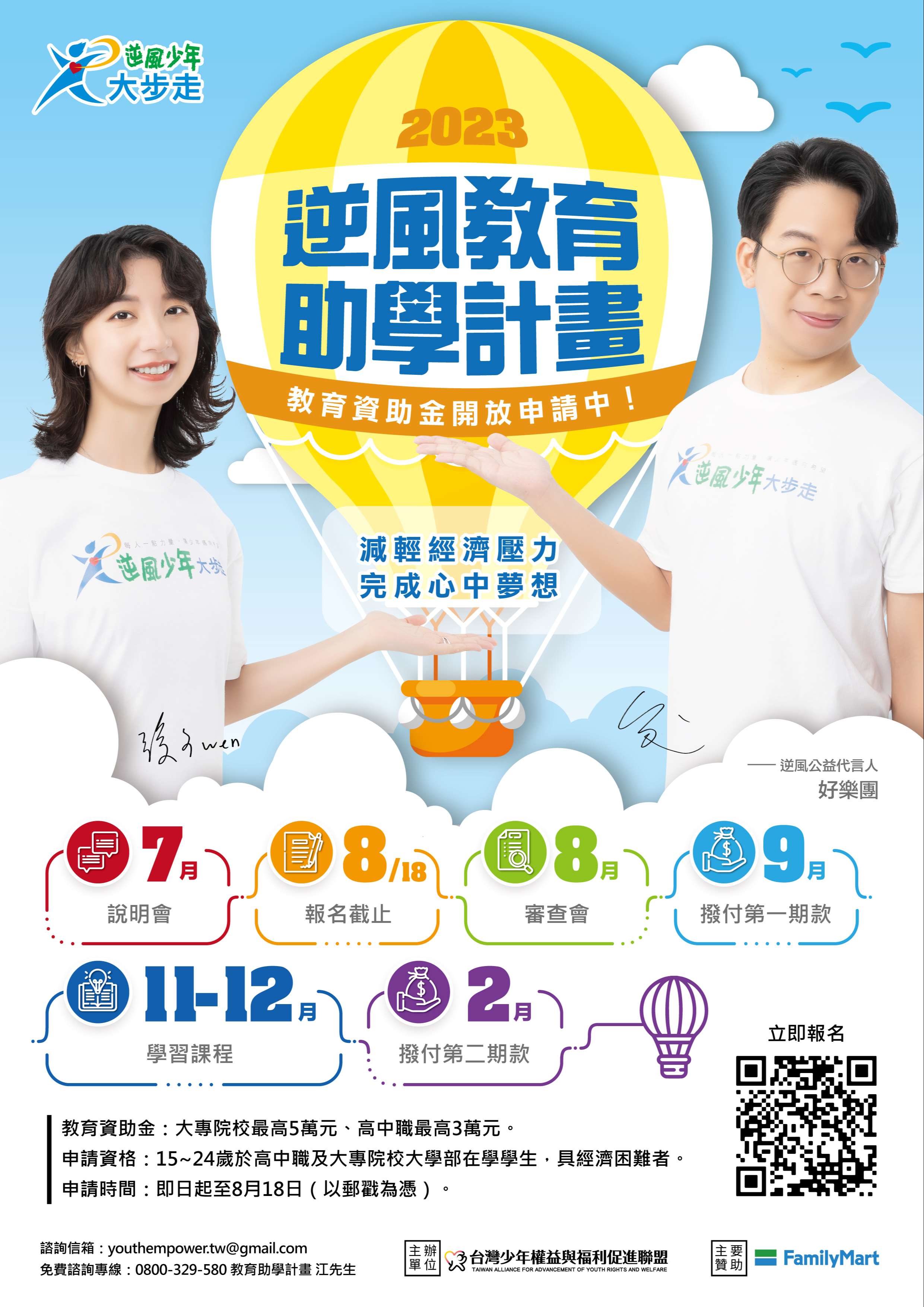 一、本活動旨在協助15至24歲具經濟困難者之高中職及大專院 校大學部在學學生,透過申請計劃,獲得教育資助金減輕 經濟壓力,並勇於追求夢想、實現自我。