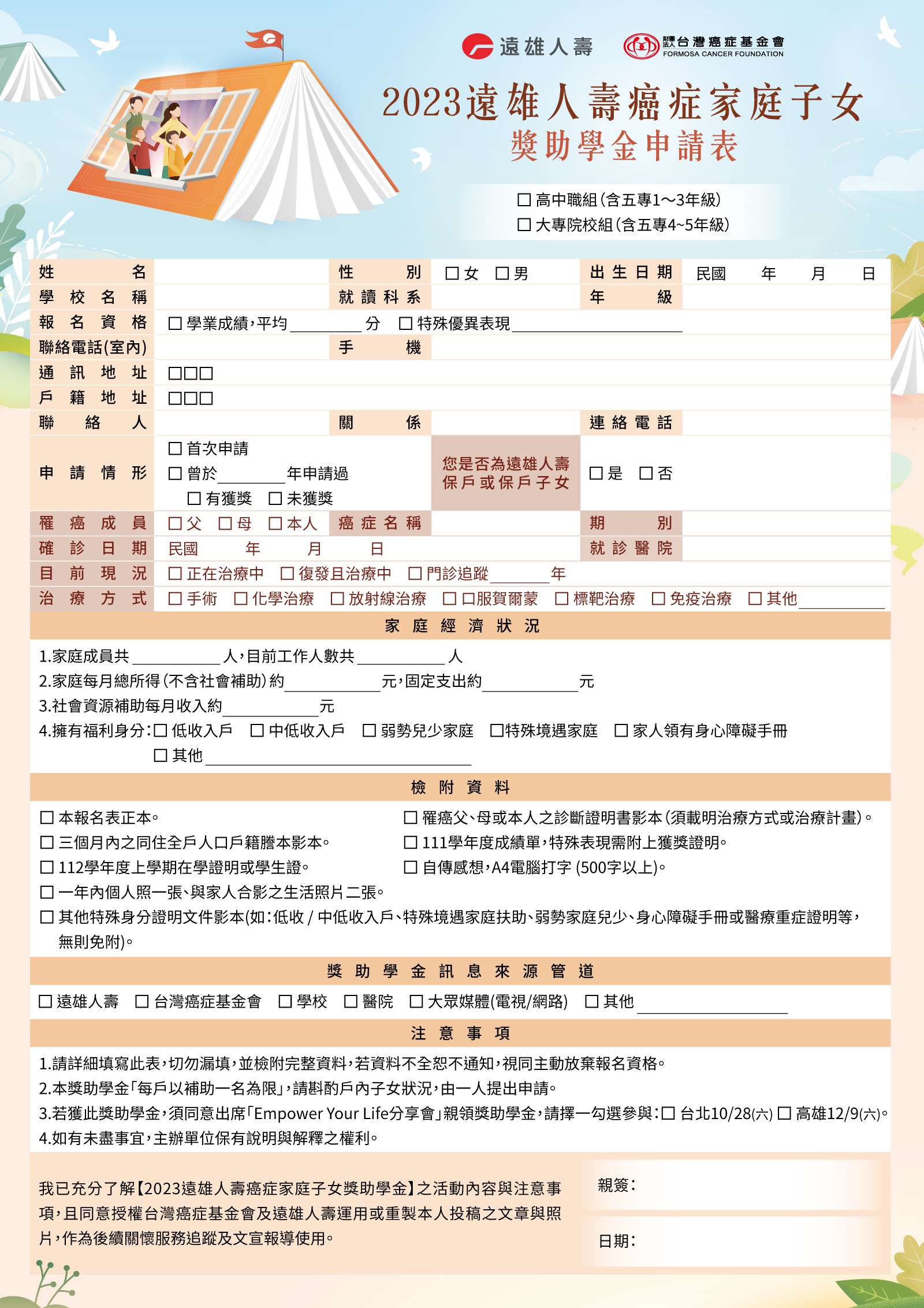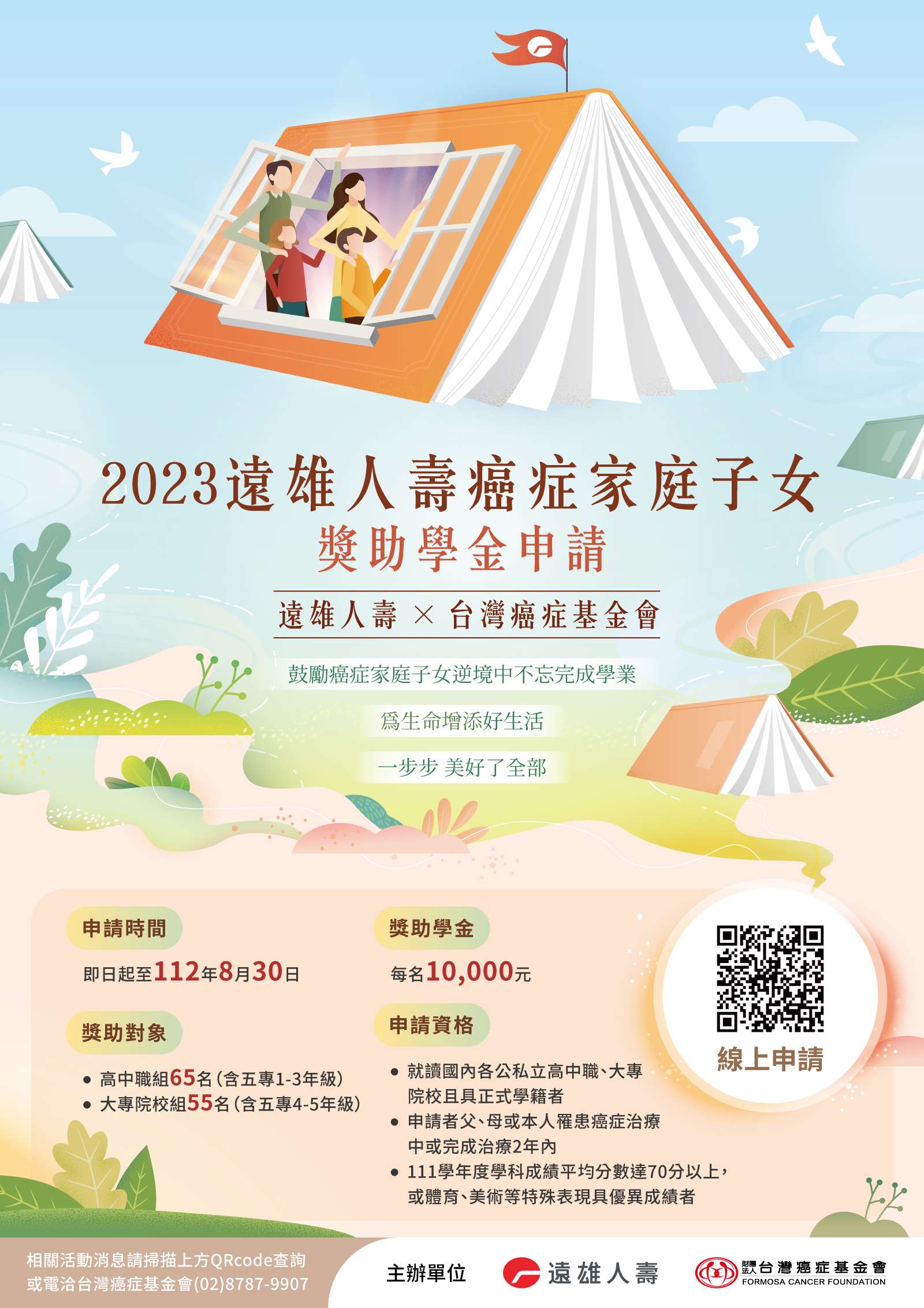 二、本會特規劃「2023台灣癌症基金會x遠雄人壽-癌症家庭子 女獎助學金」活動,針對高中職與大專院校之在學學生, 提供獎助學金,期藉此減輕癌症家庭之經濟壓力,亦讓其 子女們在獎助學金的鼓勵下,感受社會對癌症家庭的支 持,更激發其積極向上求學之心。