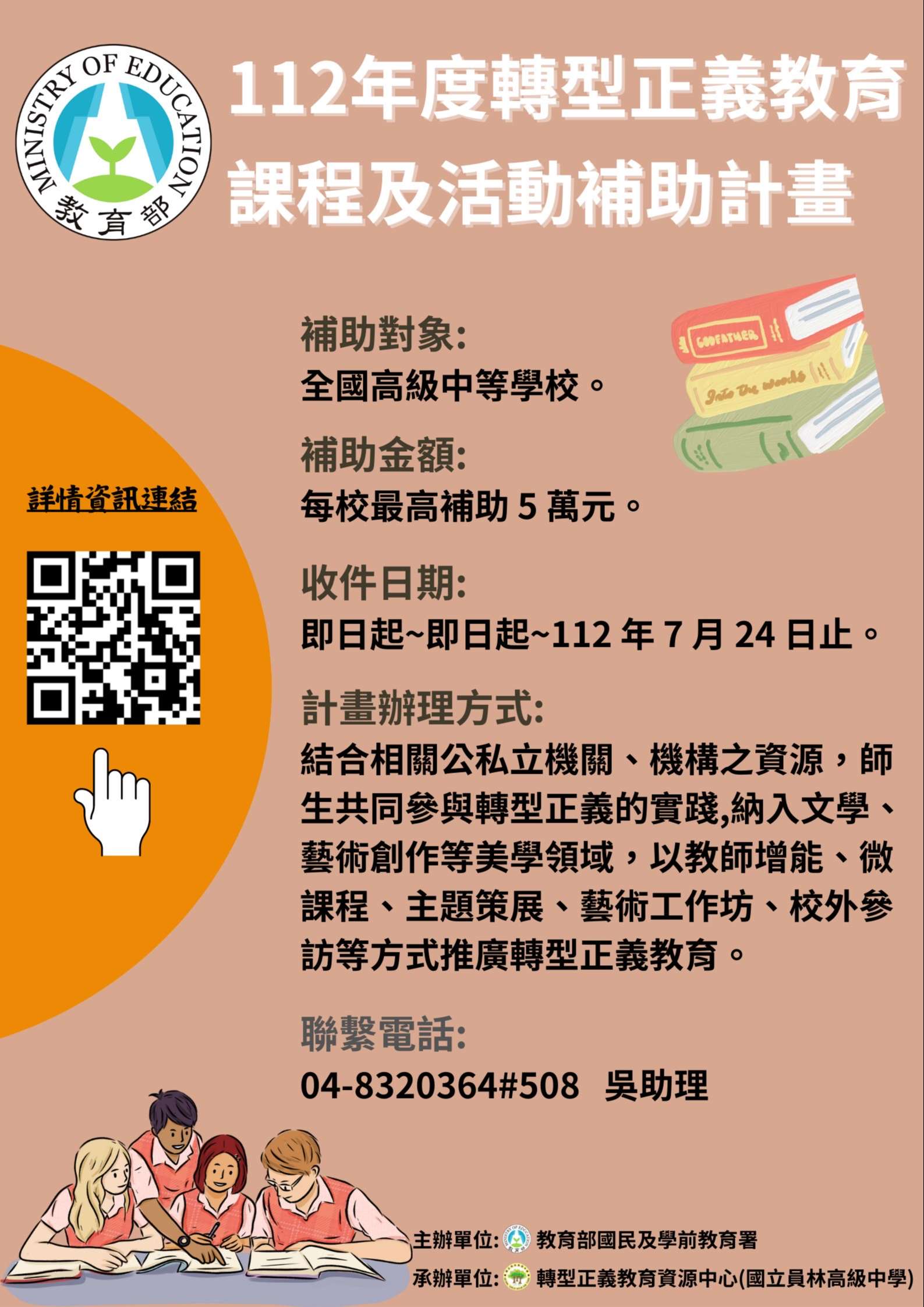 (四)計畫辦理方式:結合相關公私立機關、機構之資源,師生共同參與轉型正義的實踐,納入文學、藝術創作等美學領域,以教師增能、微課程、主題策展、藝術工作坊、校外參訪等方式推廣轉型正義教育。
