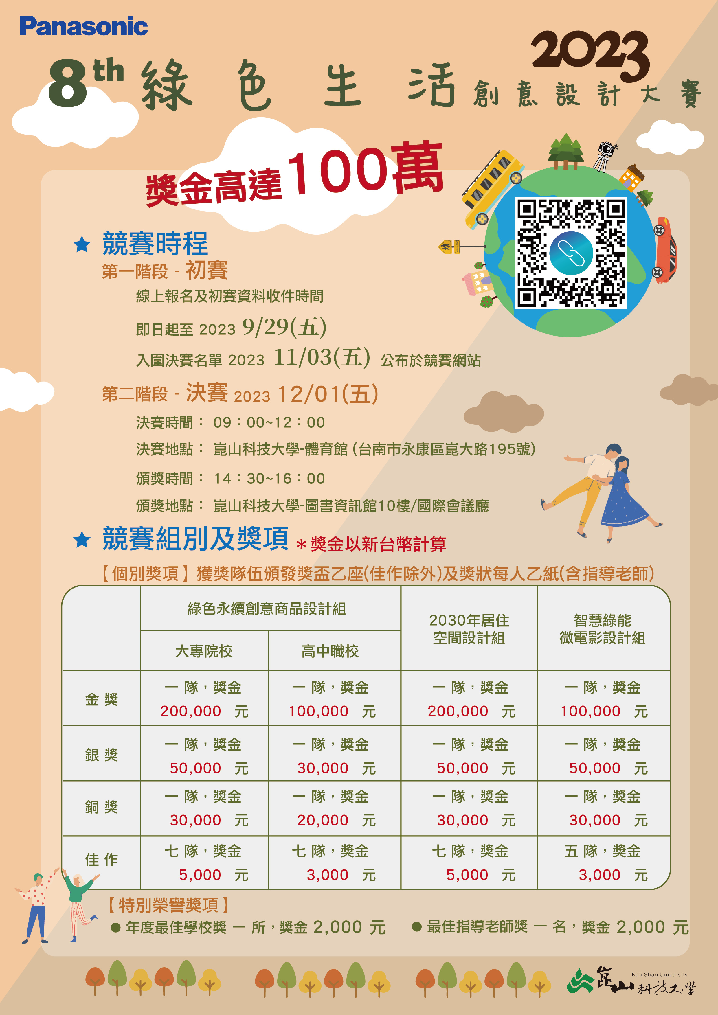 主旨:台灣Panasonic集團主辦「第八屆2023 綠色生活創意設計大賽」,請師生踴躍報名參賽,活動資訊詳如說明,請查照。