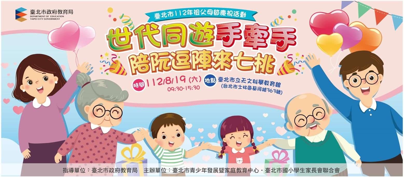 臺北市青少年發展暨家教中心於八月十九日舉辦本屆「祖父母節」慶祝活動,活動主題「世代同遊手牽手,陪阮逗陣來七桃」 強調共遊共學,寓教於樂,增進親子世代間共處的機會,透過攤位闖關以及達標贈送天文館劇場門票的活動,創造共同話題與回憶,累積祖孫相處的溫馨時光。報名網址[請點此]