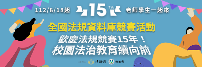 四、請貴機關學校於活動期間內,利用機關網站或跑馬燈協助活動宣導,相關活動文宣及網站連結圖示,請逕至「第15屆全國法規資料庫競賽活動網站」(https://compete.law.moj.gov.tw/)之「法規資源/下載專區」下載。