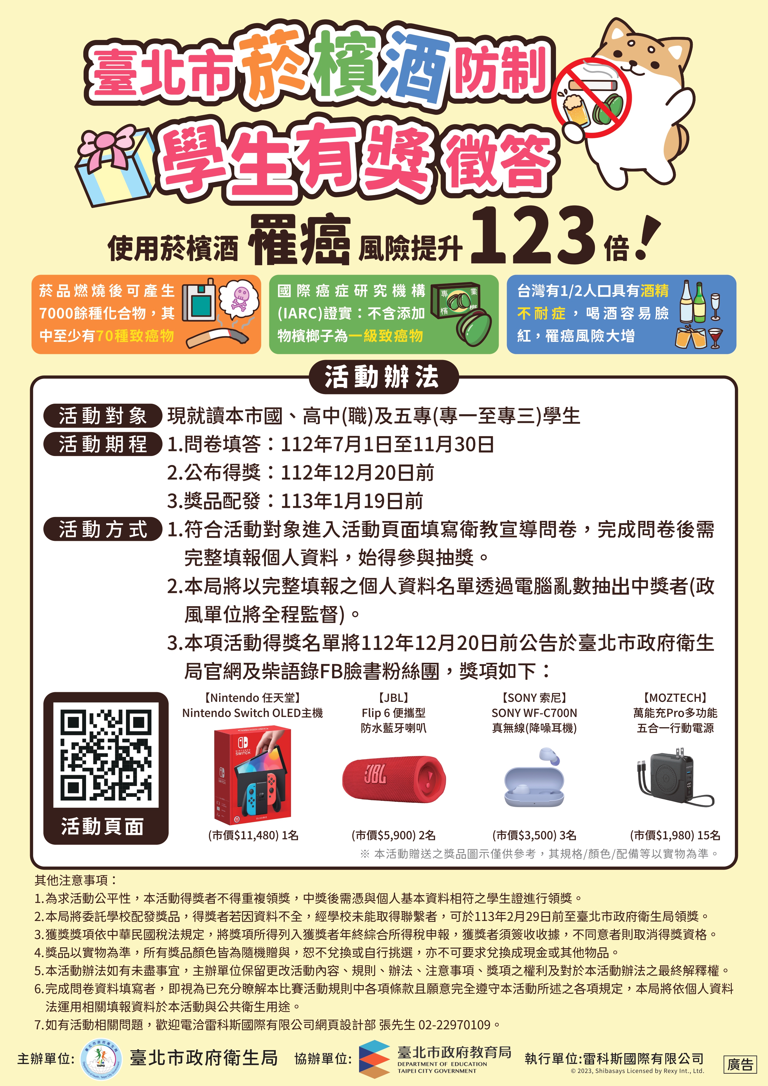 3. 本項活動得獎名單於112年12月20日前公告於台北市衛生局官網及柴語錄FB臉書粉絲團,獎項如附件