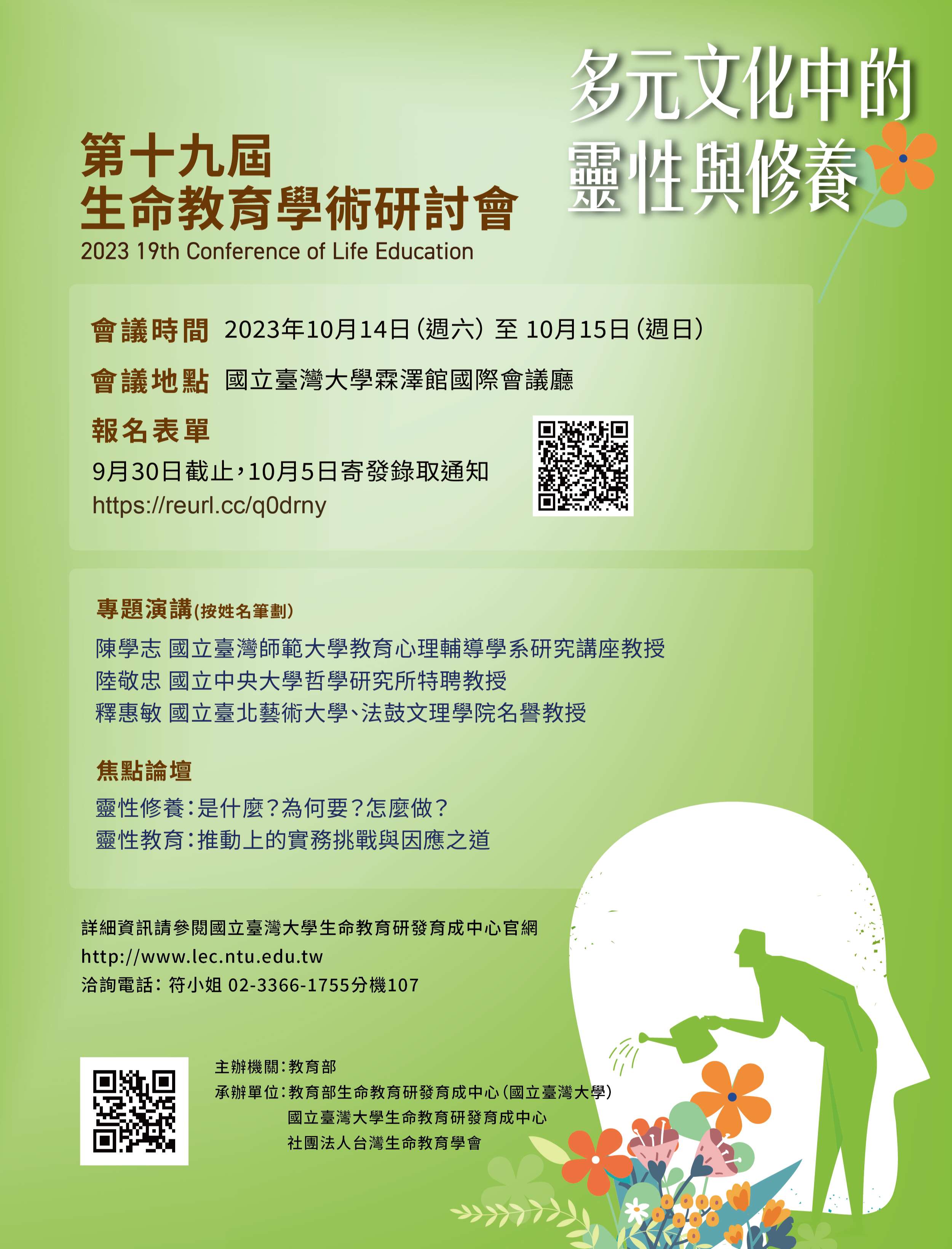 一、本校生命教育研發育成中心將於112年10月14至15日舉辦「第十九屆生命教育學術研討會」。