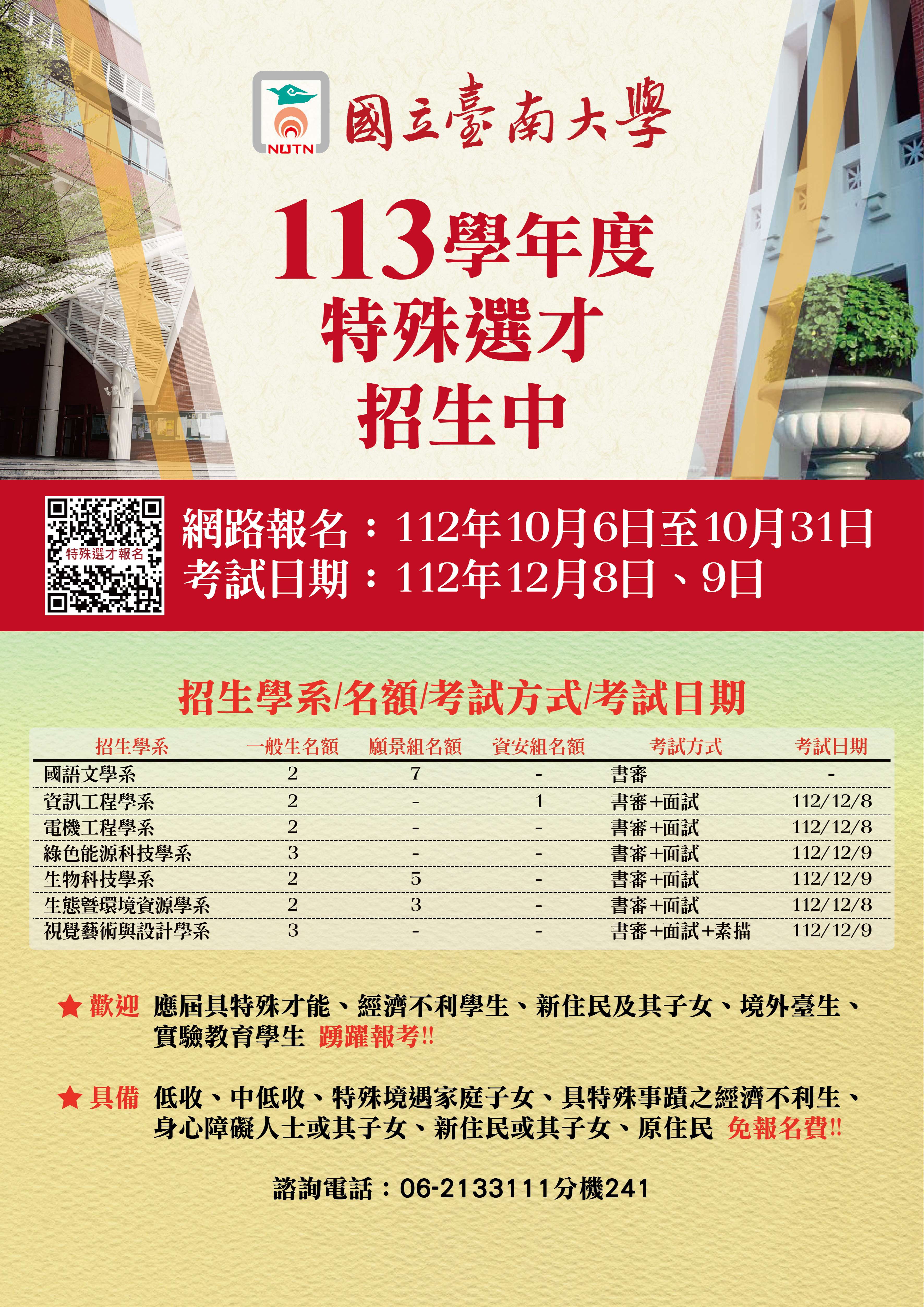 三、招生名額、招生組別、報考資格、考試項目及其他相關規定請詳閱招生簡章,招生諮詢服務請洽本校教務處企劃組(電話:06-2133111轉分機241)。