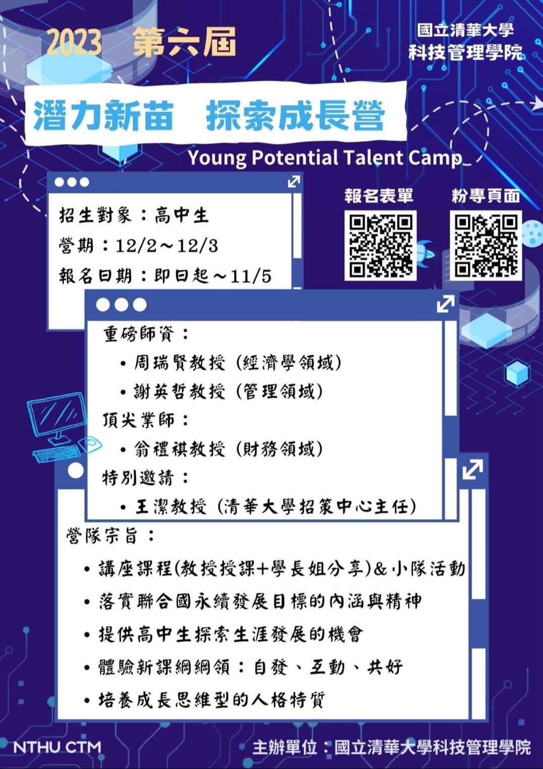 二、為期兩日的營隊,在輕鬆愉快的氛圍下,讓每一位學員滿 載而歸,首次與本校招策中心合作,提供第一手招生資 訊,讓學員善用資源進入清華的大家庭。並安排科技管理 學院最專業的教授講座,為學員指引未來生涯發展方向, 邀請優秀的學長姐們,分享修課與課外活動經驗。利用大 地遊戲和商業競賽,讓參與的學員認識本院也結識來自各 地的同儕,培養思考分析和溝通能力。