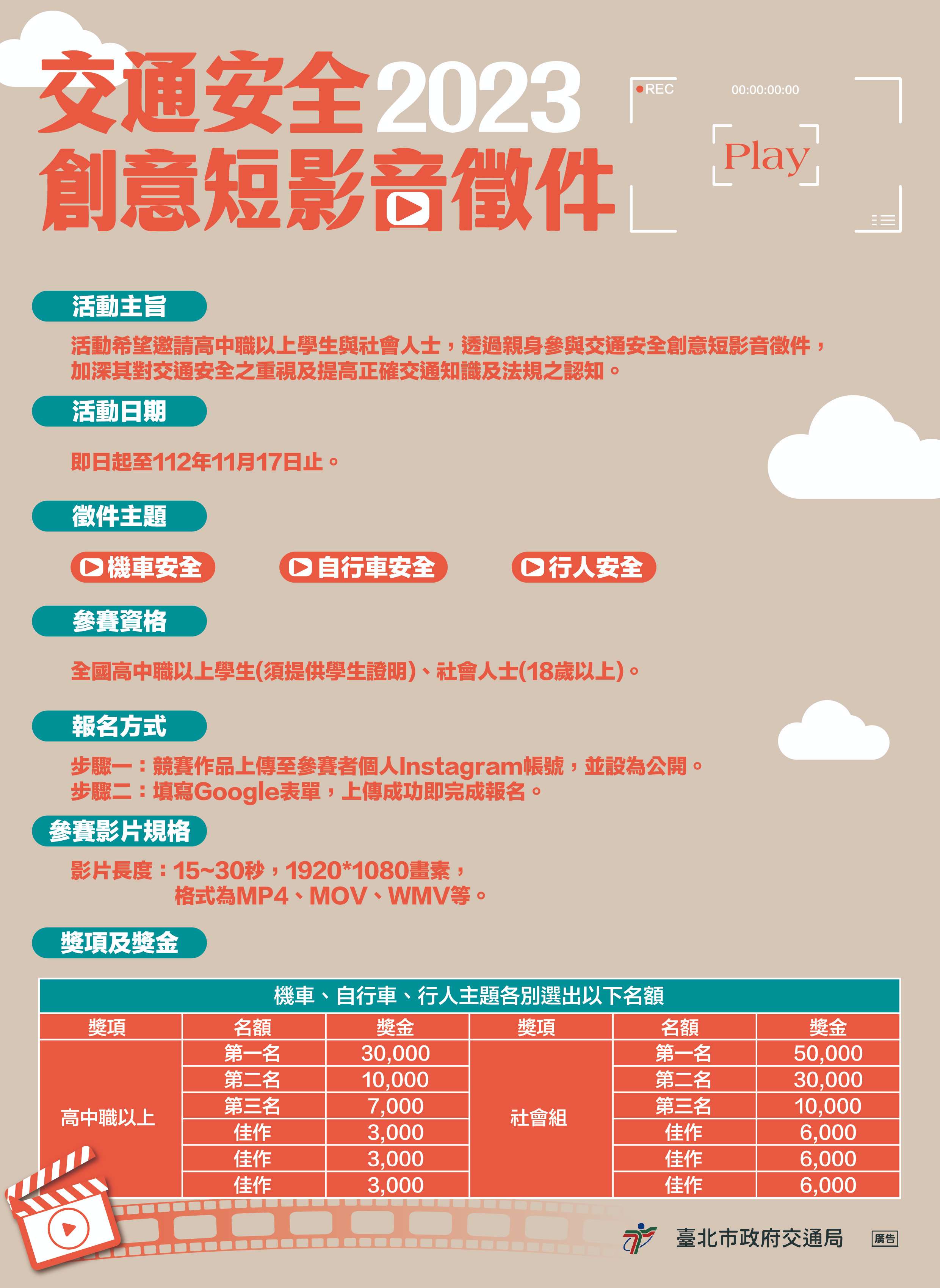 為強化民眾交通安全意識,透過親身參與交通安全創意短影音徵件,加深對交通安全之重視及提高正確交通知識及法規之認知,辦理「交通安全創意短影音徵件」競賽,獎金總額高達近50萬,分為高中職以上學生組及社會組,全面採線上報名。