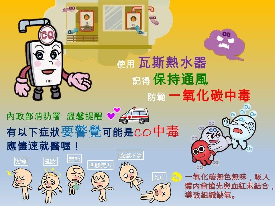 冬季將至,為關心全校師生防範一氧化碳中毒,於居家住宅、或所到餐廳、旅館、健身中心、游泳池、三溫暖、浴室等使用燃氣熱水器或鍋爐之公共場所務必留心一氧化碳安全觀念。