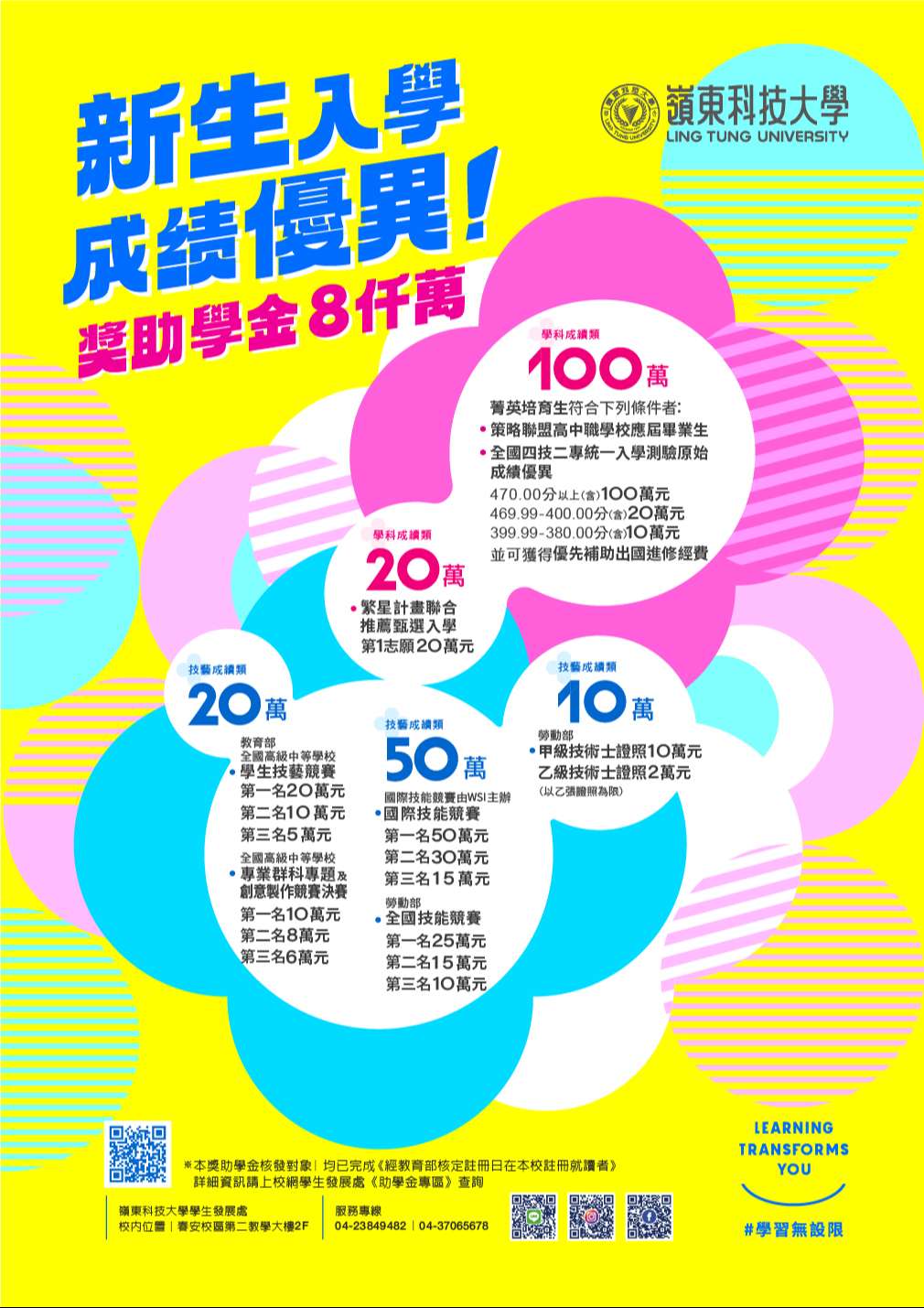 一、本校113學年度特提供新生入學成績優異助學金方案計新台 幣捌仟萬元,敬請協助公告師生周知(如附件)。