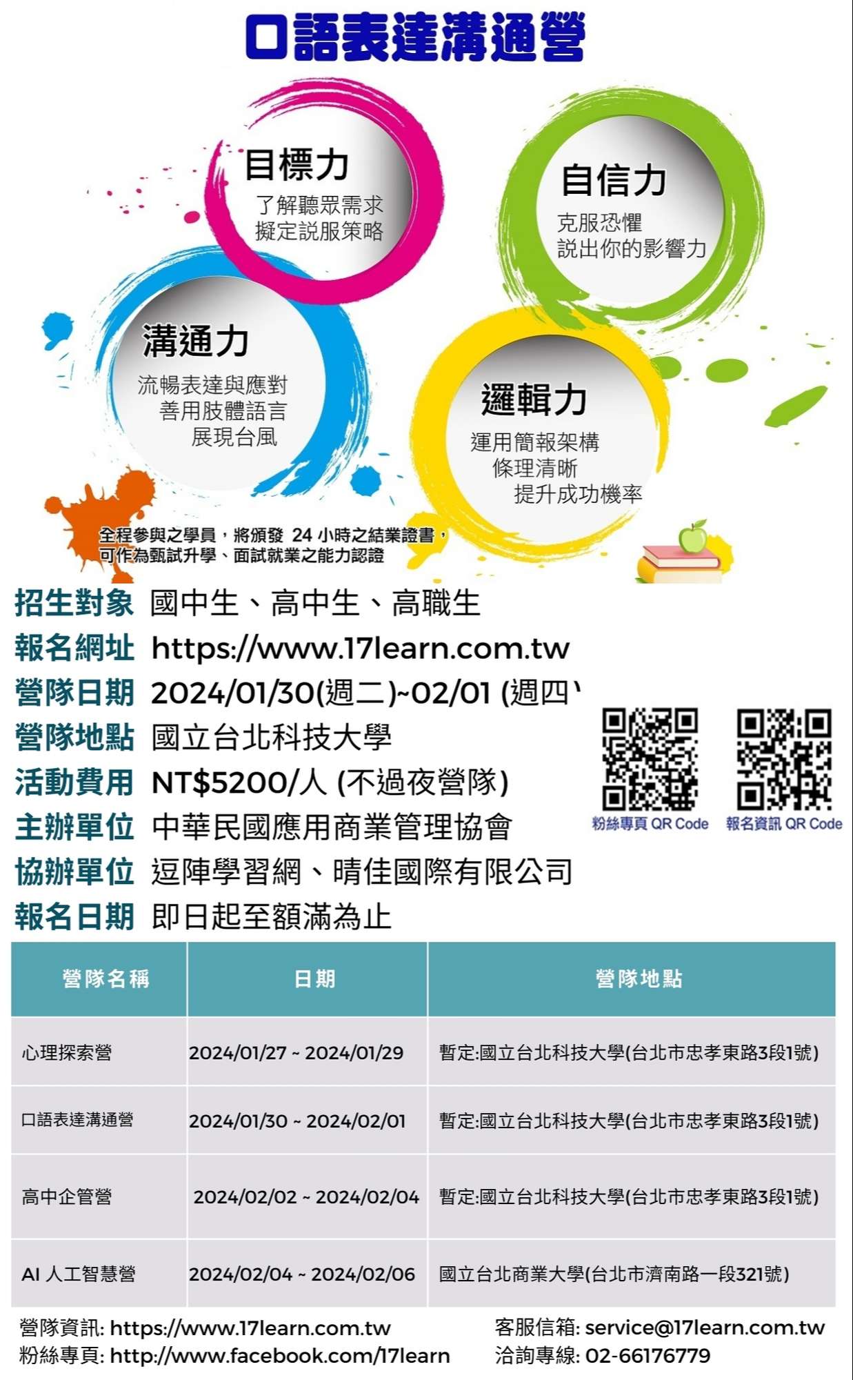 十一、另有:心理探索營、高中企管營、AI人工智慧營多項營 隊,歡迎報名參加。