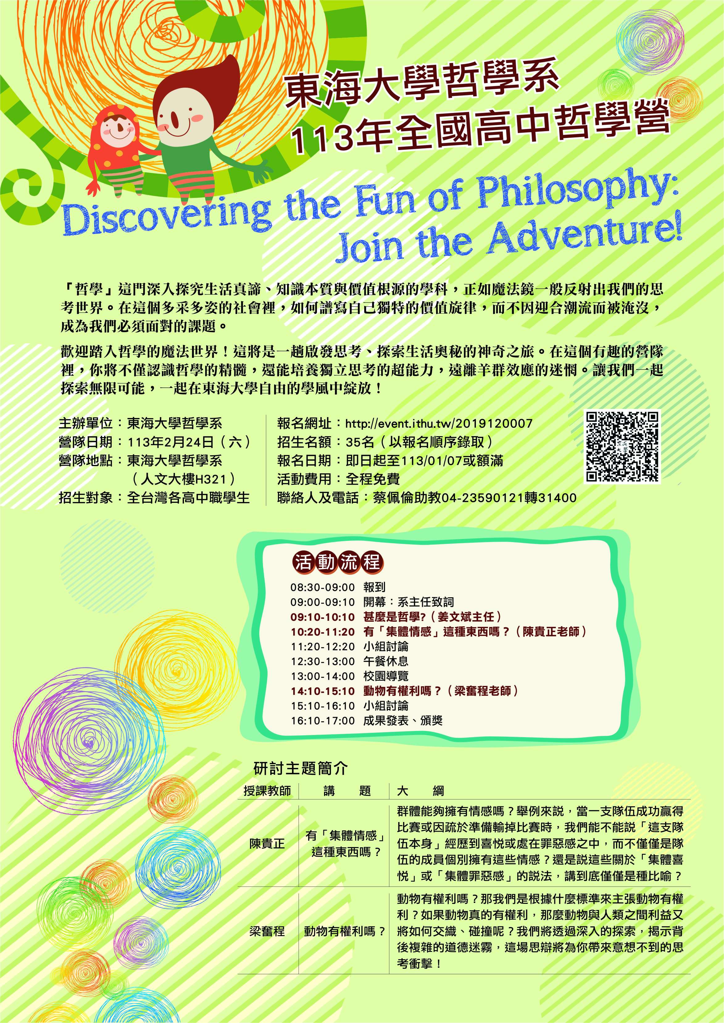 二、本校哲學系亦可提供各高中哲學概論或哲學入門等相關課 程,以引導高中生對大學科系之認識,歡迎貴校洽詢。