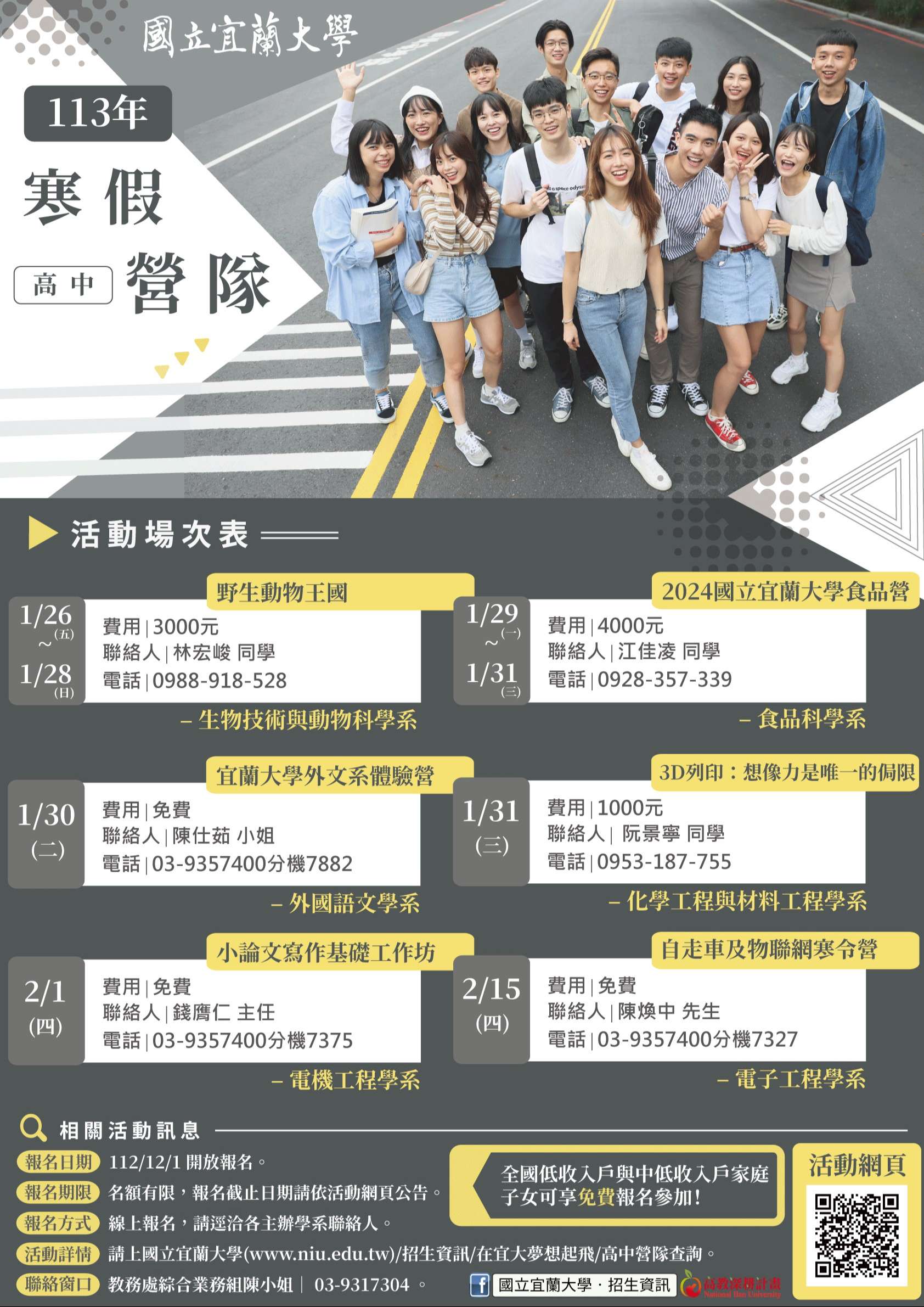 一、檢附活動海報乙份,營隊資訊請至活動網站查閱(網址:請點此 ),或由國立宜蘭大學首頁(網址: 請點此 )/招生資訊/在宜大夢想起飛/高中營隊查詢。