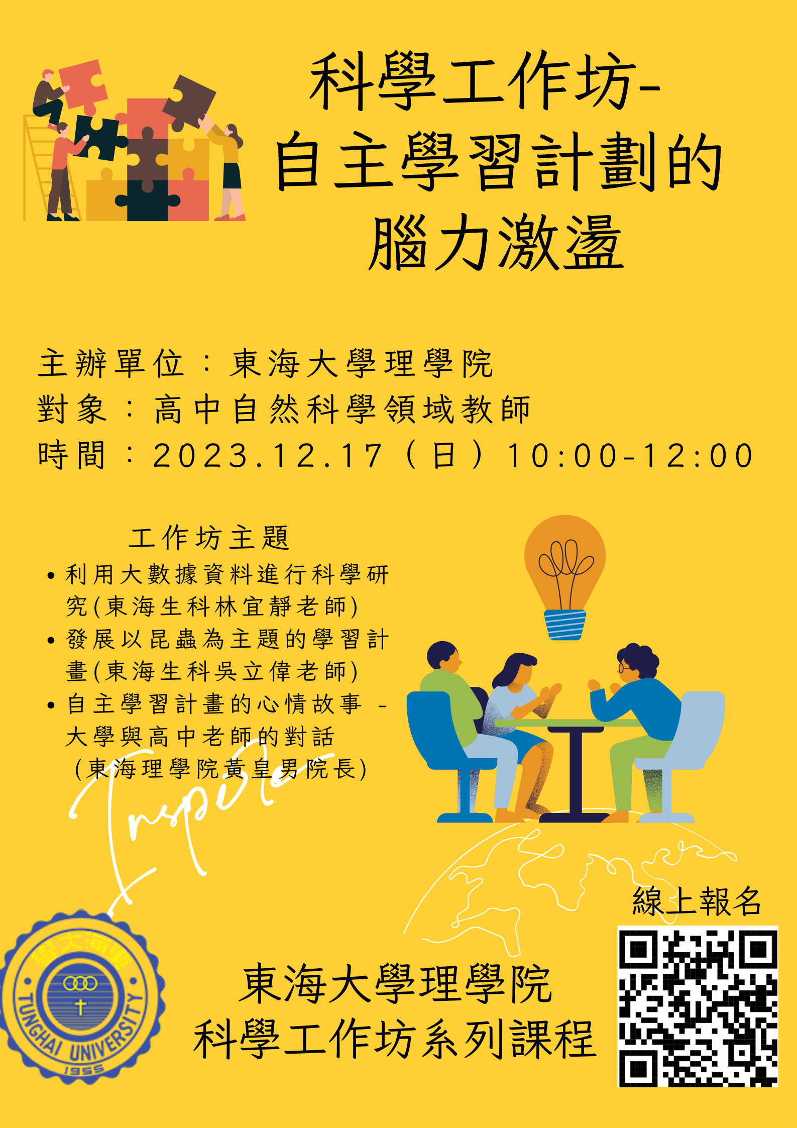 二、活動相關資訊如附件,或可至全國教師在職進修資訊網頁(請點)搜尋「東海科學工作坊」。