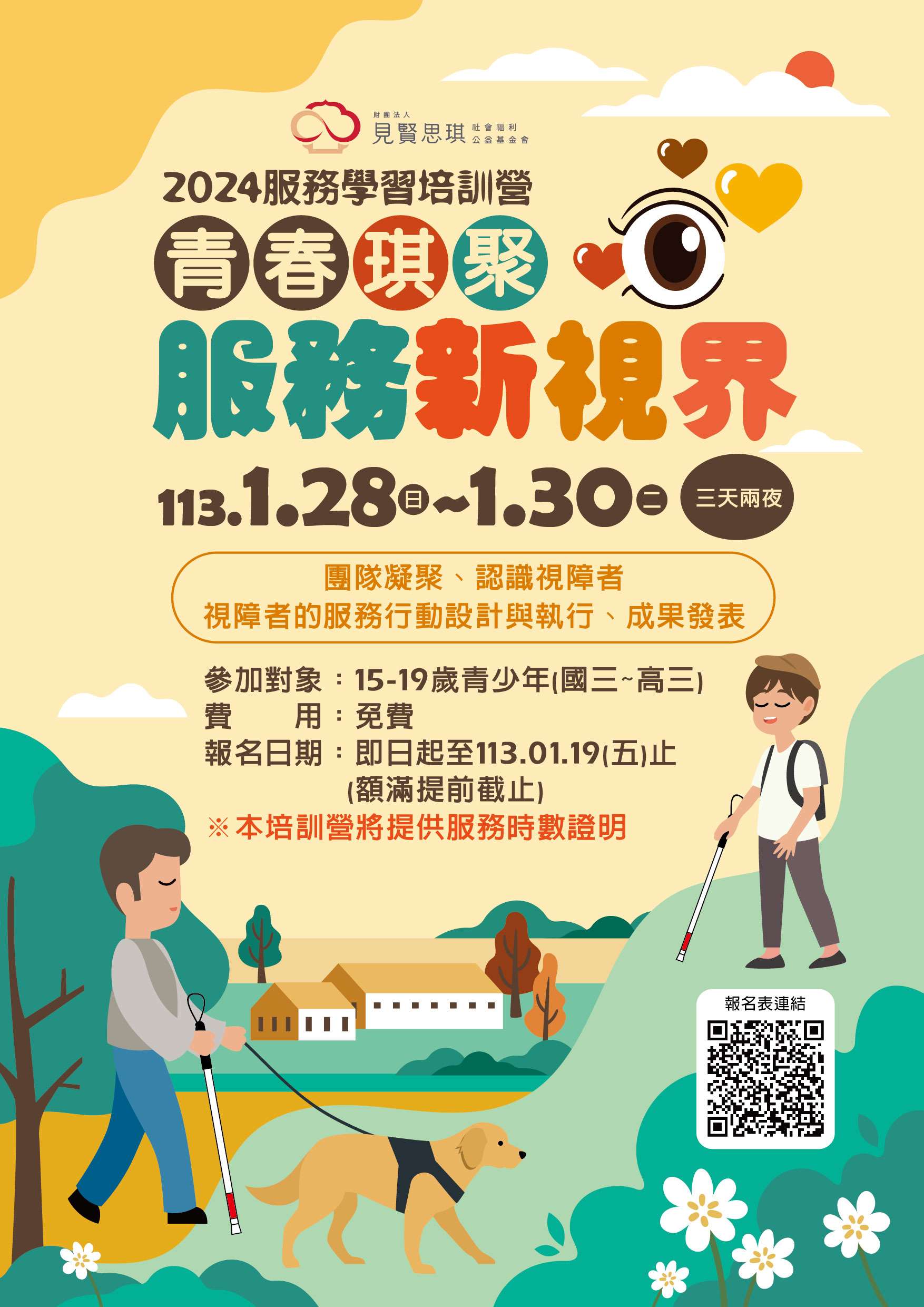 一、本會規劃辦理2024「青春琪聚-服務新視界」寒假服務學習 培訓營;透過做中學提供社會參與機會,增進青少年對公 共議題的關心,豐富其學習視野,歡迎有服務熱忱的青少 年踴躍參與。