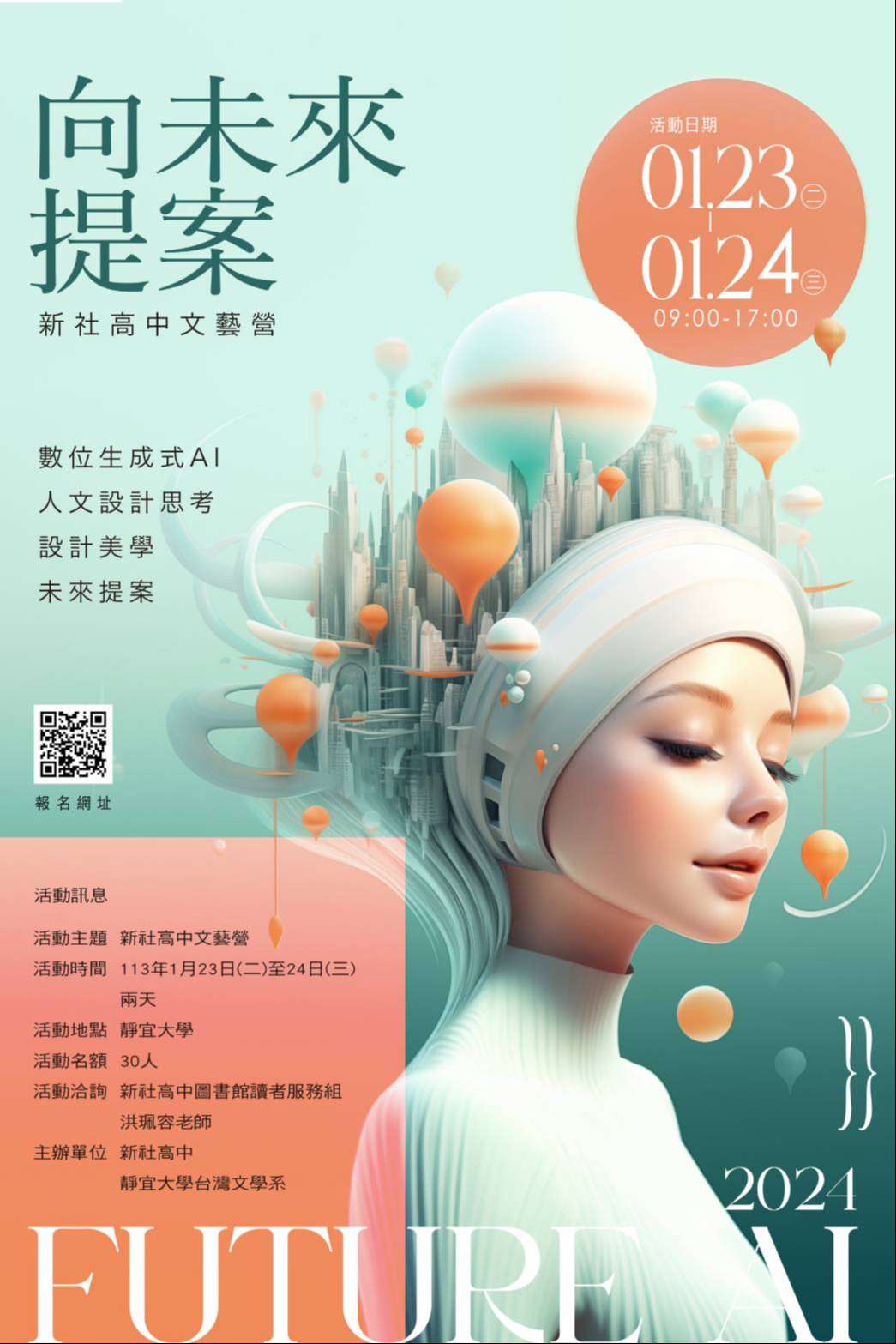 一、本校台灣文學系於寒假辦理文學營隊,2024年以「向未來 提案」為題,運用「數位生成AI」,進行人文設計思考及 設計美學創發,讓學生由文字進行文學轉譯,向「未來」 提案。