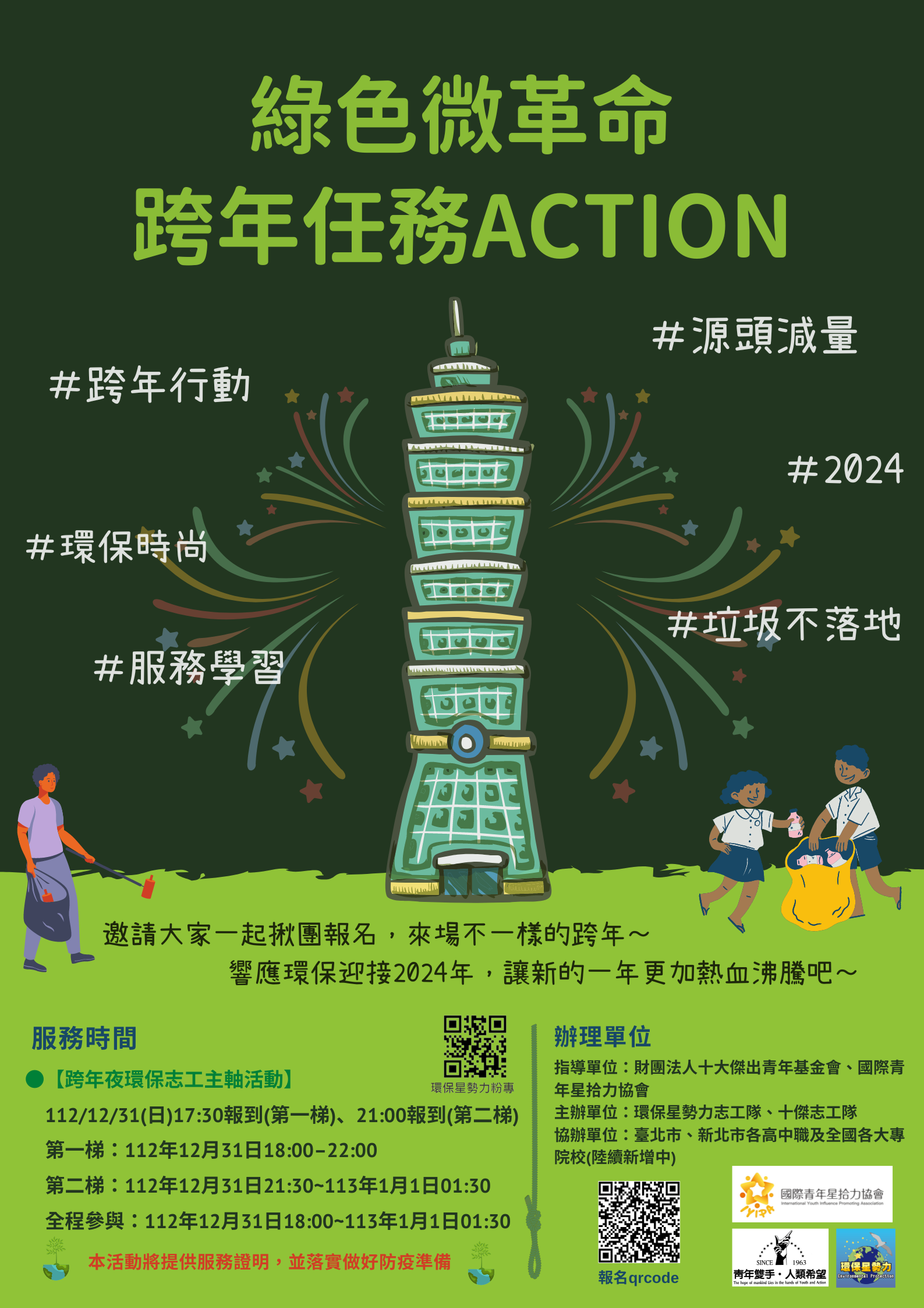 主旨:於今年12月31日下午17:30假財團法人十大傑出青年基金會輔導之青年志工團隊──環保星勢力志工隊辦理「2023-2024綠色微革命-跨年任務 ACTION」。誠摯邀請響應。
