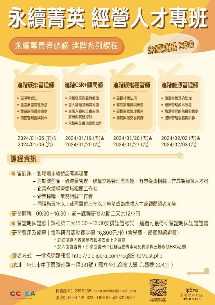 一、社團法人中華三創菁英協會辦理【永續專責者必修】進階 系列課程,敬邀對環境永續發展、碳盤查(碳減量管理、碳 權交易管理)永續經營領域有興趣,或希望與企業進行產學 合作的教師參加本培訓系列課程