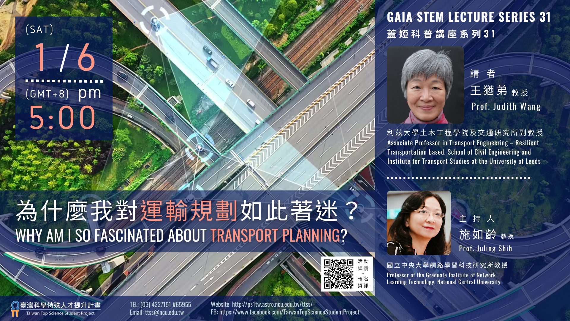 主旨:轉知113年1月6日辦理線上講座:《蓋婭科普講座系列31》— 「為什麼我對運輸規劃如此著迷?」。