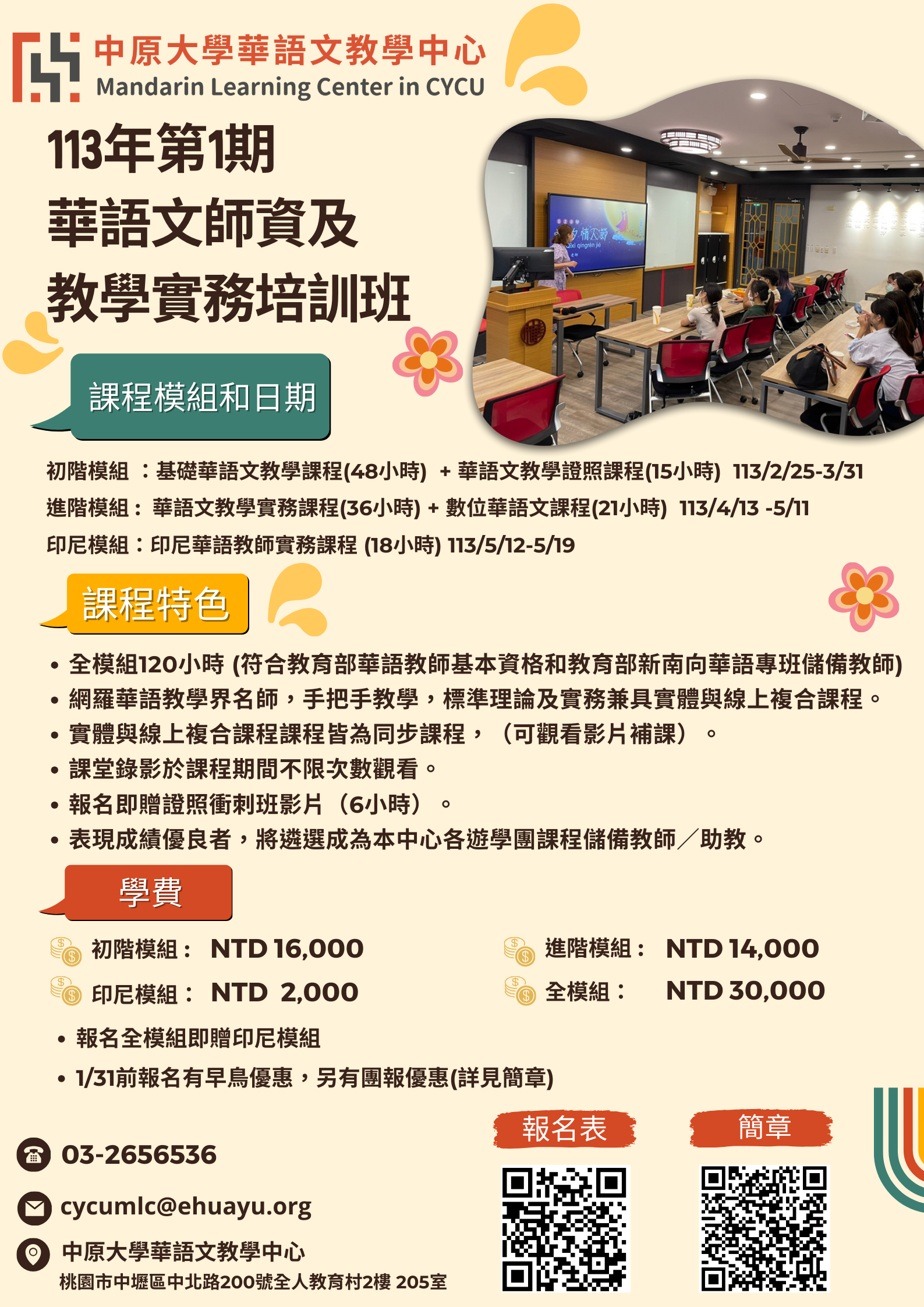 中原大學辦理「113年第1期華語文師資及教學實務培訓班」