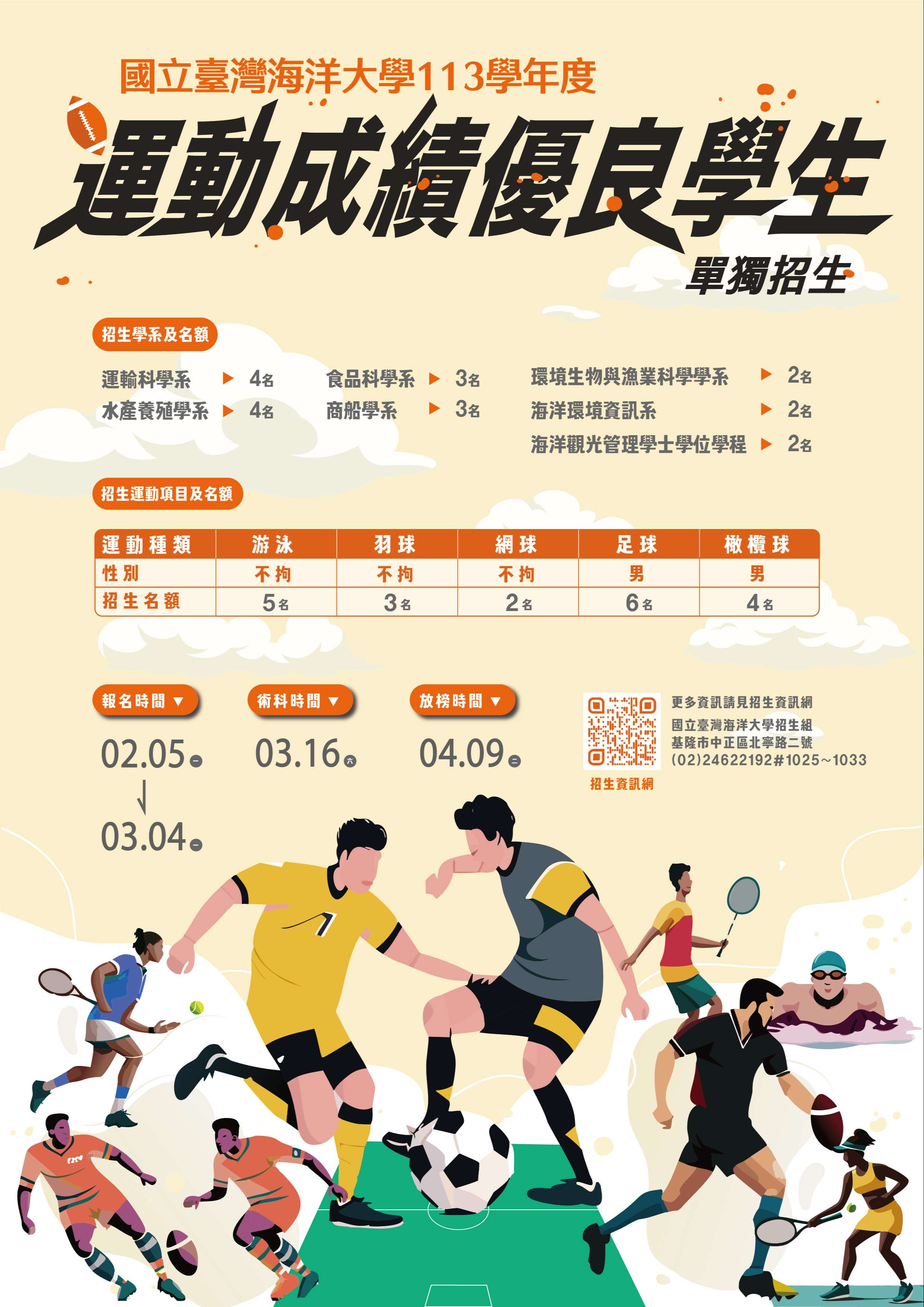 一、旨揭招生管道重要資訊如下: (一)報名時間:113年2月5日(星期一)上午8時起至113年3 月4日(星期一)下午3時止受理網路報名。 (二)招生學系及名額:商船學系3名、運輸科學系4名、海洋 觀光管理學士學位學程2名、食品科學系3名、水產養殖 學系4名、環境生物與漁業科學學系2名、海洋環境資訊 系2名,合計20名。 (三)招收運動項目:游泳5名、羽球3名、網球2名、足球6名 及橄欖球4名。 二、招生簡章請至本校招生資訊網(https://admission.ntou. edu.tw/)下載。