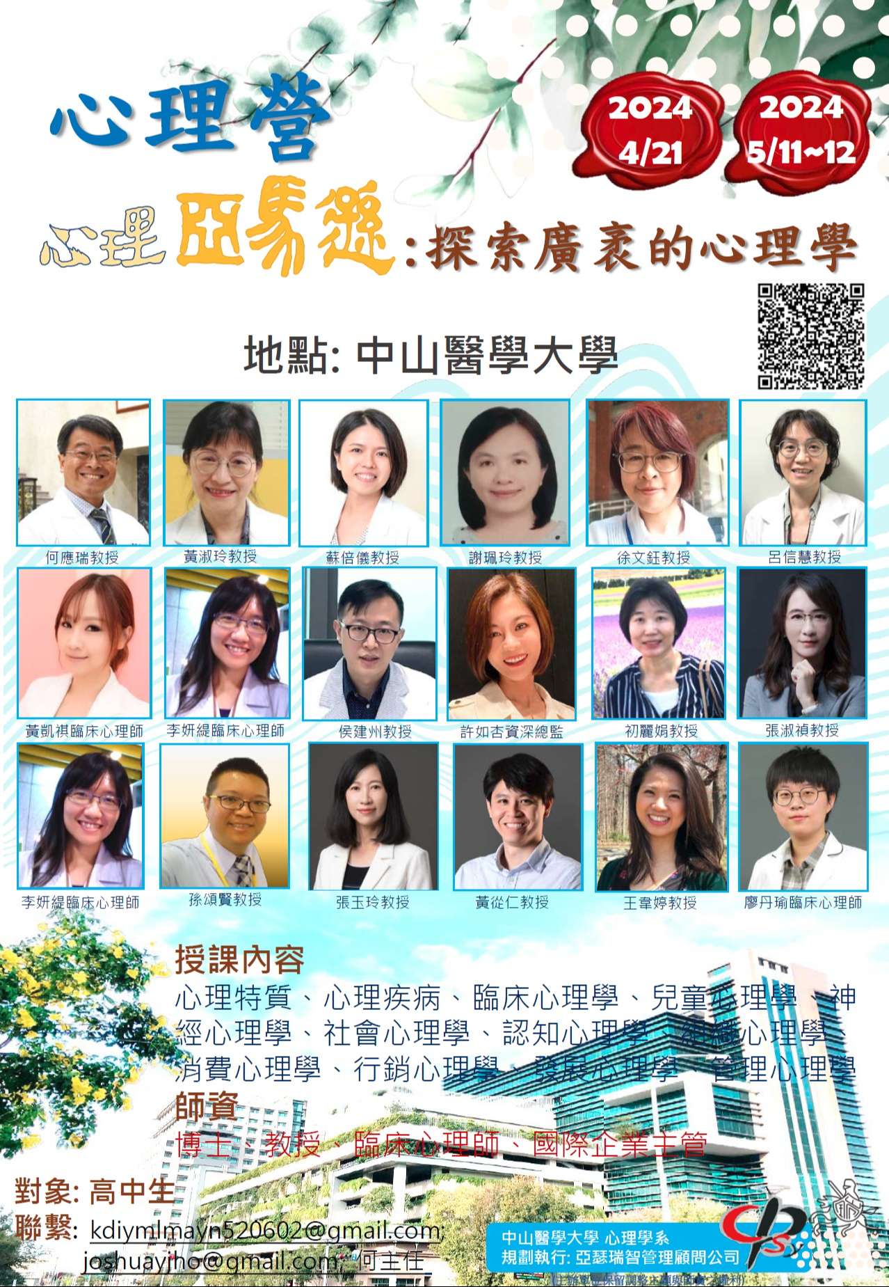 五、授課主題:心理特質、臨床心理學、認知心理學、心理疾 病、心理藥物學、行銷心理學、消費心理學、管理心理 學、發展心理學、兒童心理學。