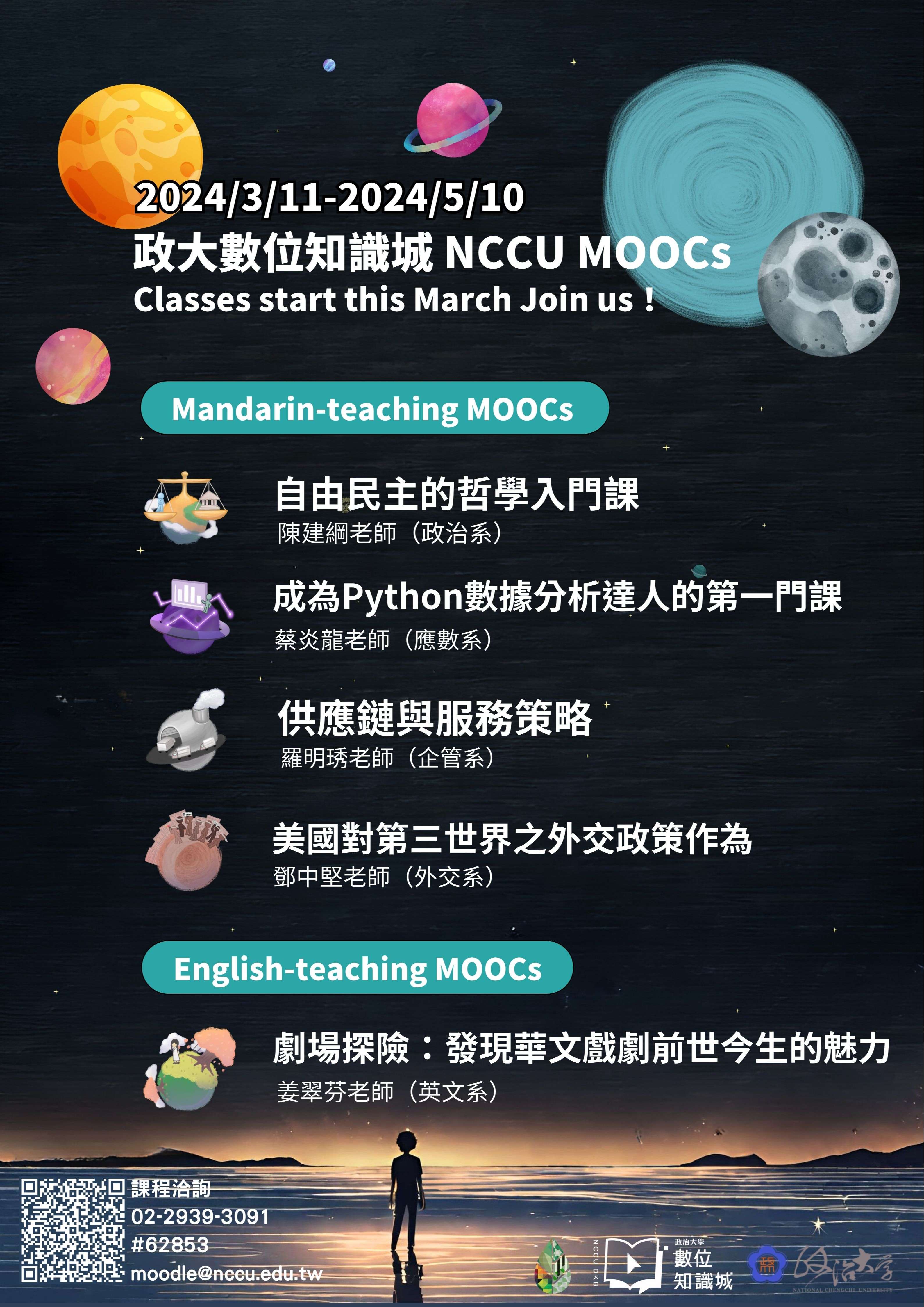 政治大學開設5門磨課師課程,即日起開放線上報名: