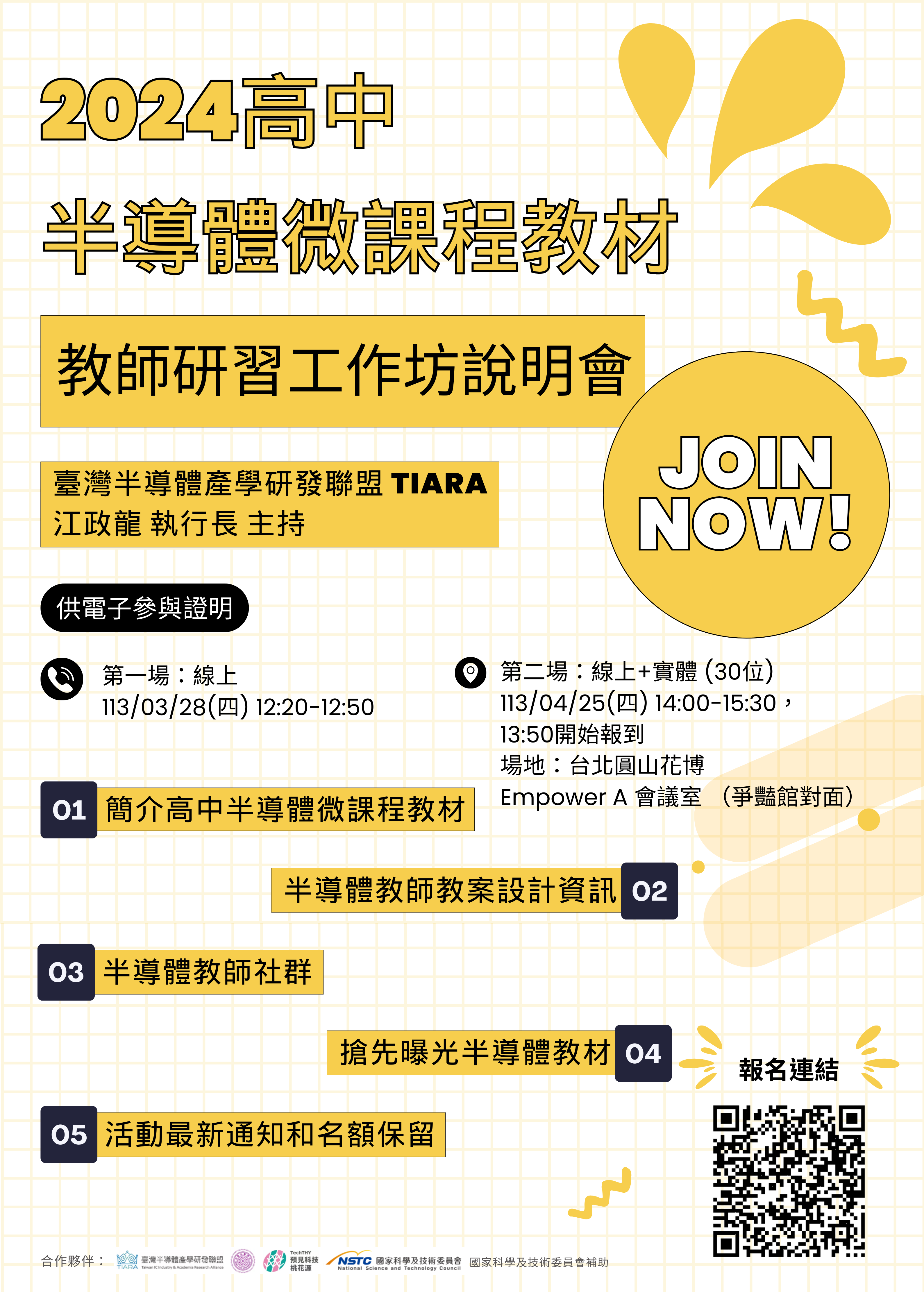 二、「高中半導體微課程教材:教師研習工作坊說明會」第一 場次(線上),謹訂於113年3月28日12時20分至12時50 分,於google meet 線上會議室舉辦。第二場次(實體與 直播)謹訂於113年4月25日14時00分至15時30分於圓山花 博園區 Empower A會議室(爭豔館對面)舉辦,並於 google meet 線上會議室同步直播。