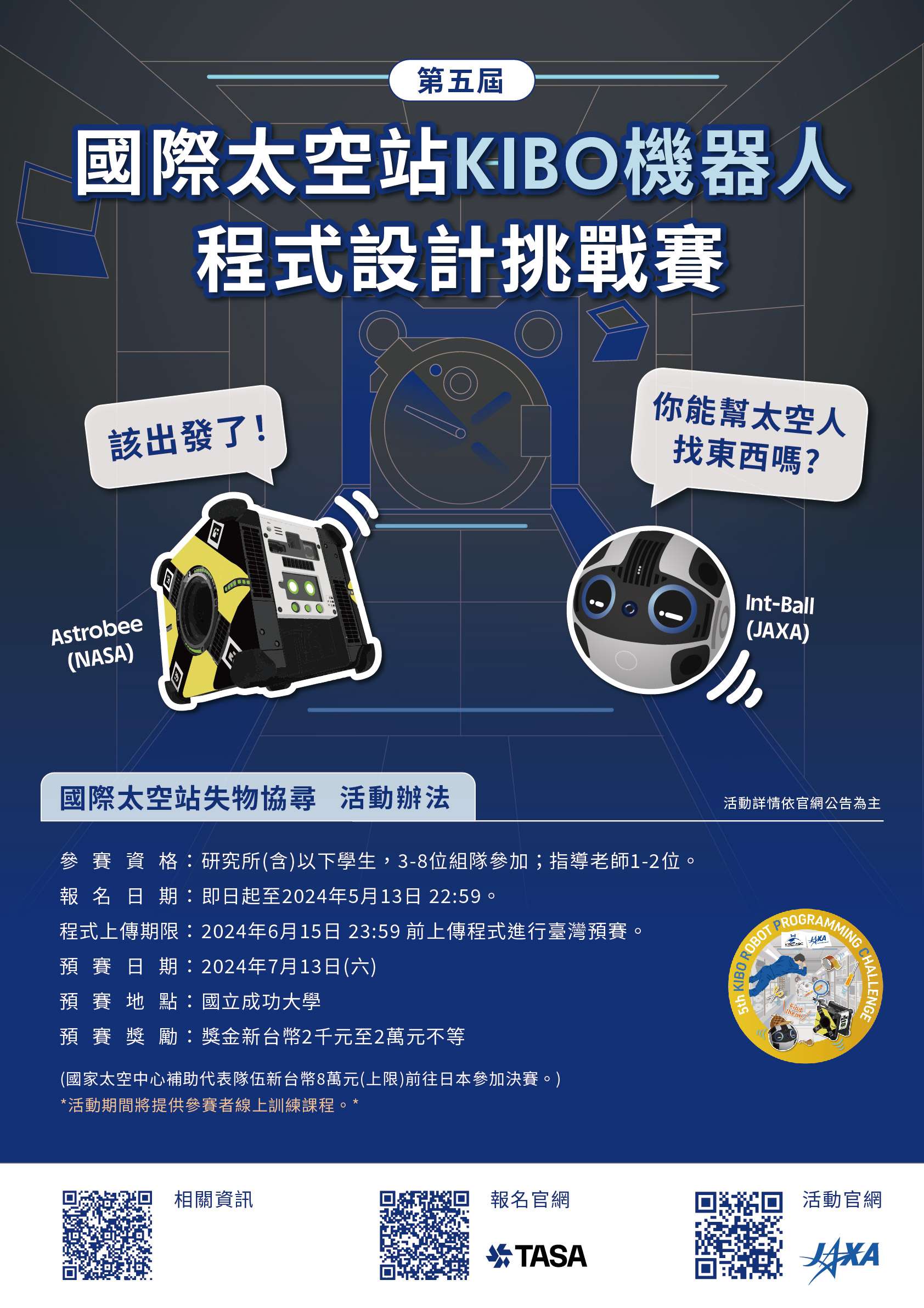 一、旨揭「第五屆國際太空站 KIBO 機器人程式設計挑戰賽」由美國國家航空暨太空總署(NASA)及日本宇宙航空研究開發機構(JAXA)合作,JAXA主辦,旨在普及日本國際太空艙(Kibo)在亞太地區的應用,提供學生學習太空機器人技術和程式設計的教育機會,實踐永續發展目標(SDGs)。臺灣預賽由該中心主辦,補助獲選團隊代表臺灣參與日本總決賽。