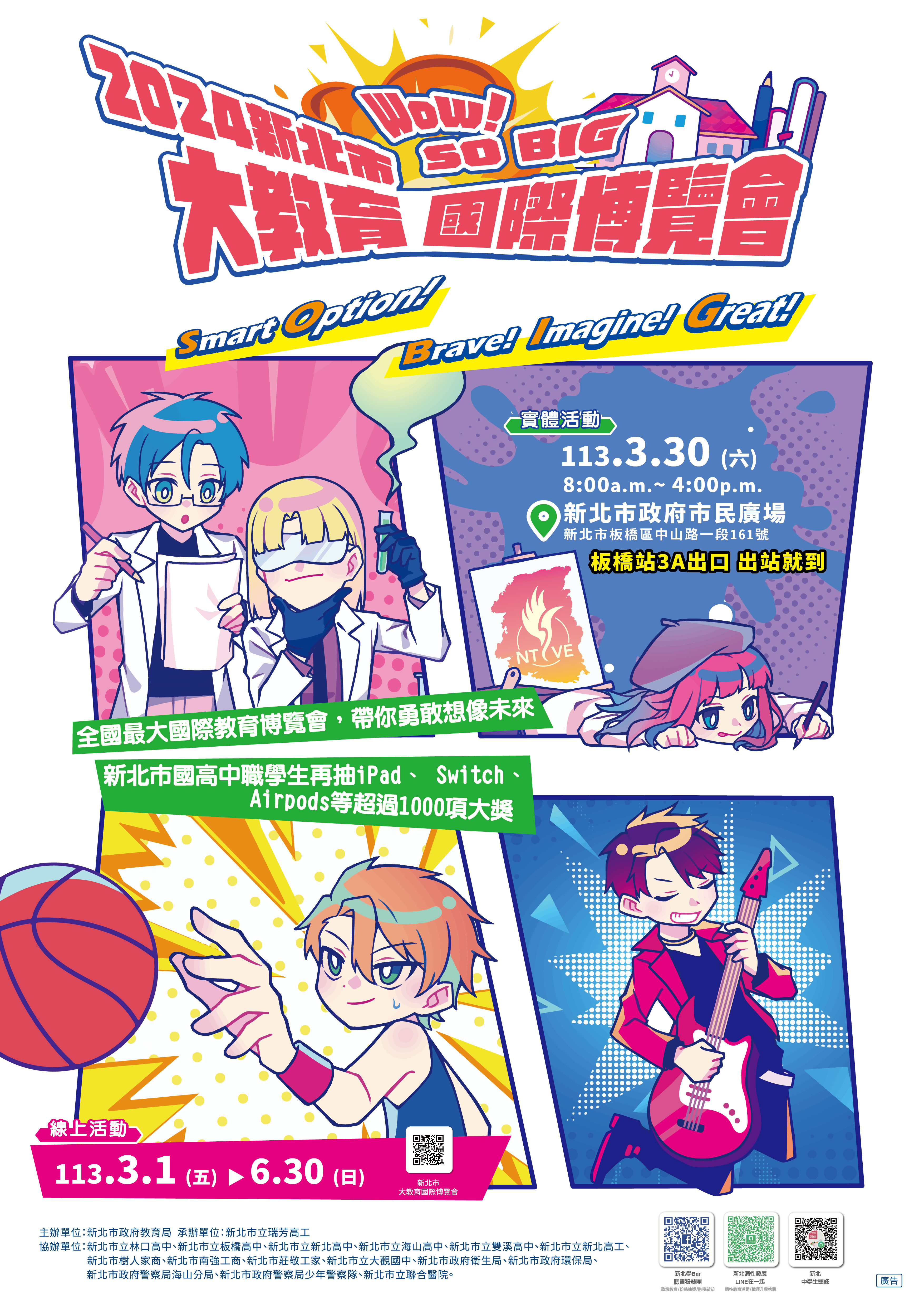 於113年3月30日(星期六)上午8時至下午4時於新 北市政府市民廣場(新北市板橋區中山路一段161號,板橋 車站3A出口),本次活動首次邀請46所大專院校及60所新北 市優質高中職學校參與,共有超過100所學校特色體驗課程,並設有國際外語及適性輔導專區、超過30個精采的表 演節目,歡迎北北基桃國高中學生及家長來現場參加,瞭 解大專院校及新北市優質高中職學校特色。