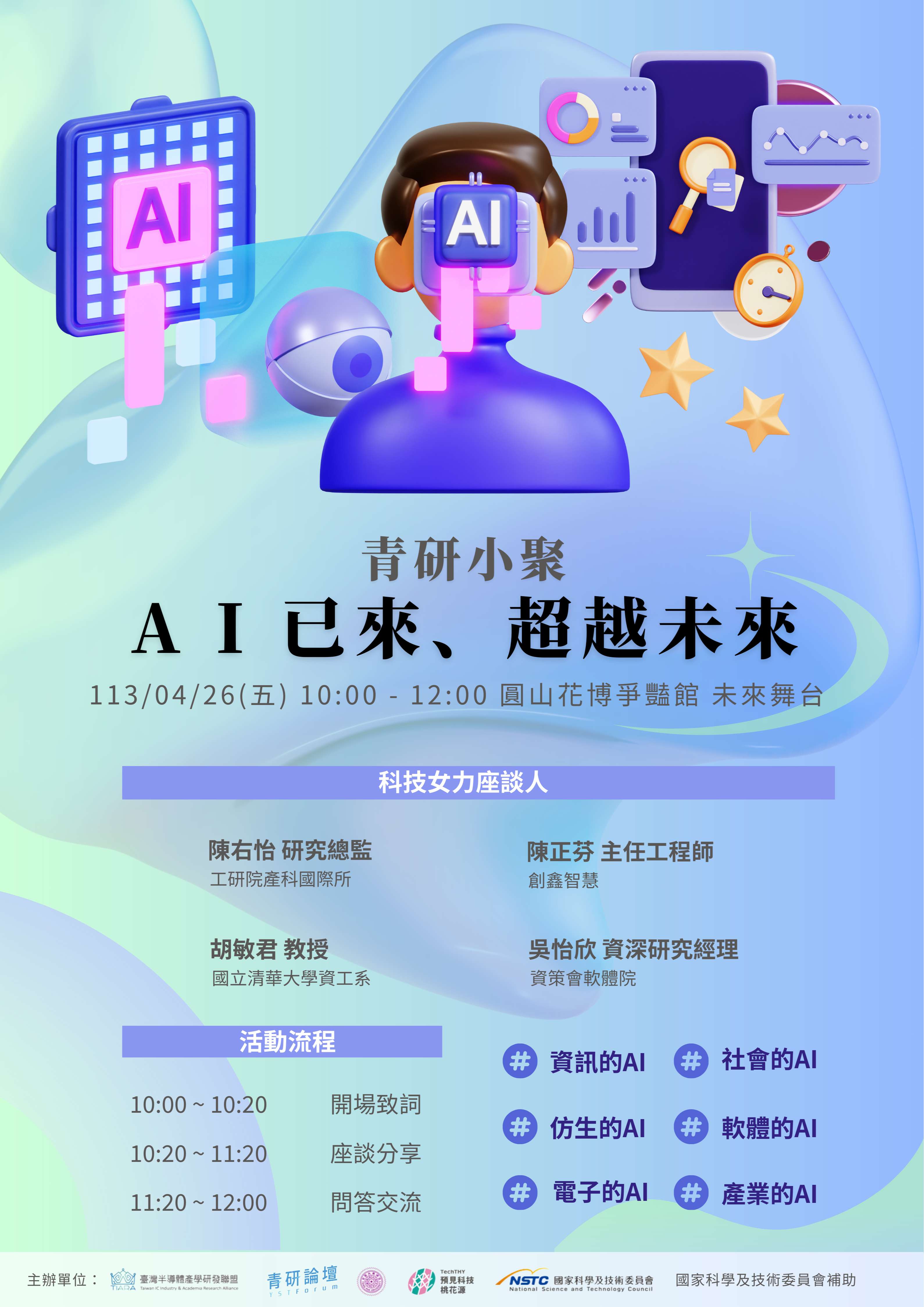 活動型式:4位座談人個別分享後,由主持人進行綜合座談(本計畫由國科會補助,強調 科技女力) 主題範疇:分享 AI 技術的應用實例與發展趨勢,引導全民認識 AI 的力量與潛能,建立 未來與 AI 合作正面觀念,及鼓勵大眾與青年善用 AI 科技,讓世界與未來變得更美好