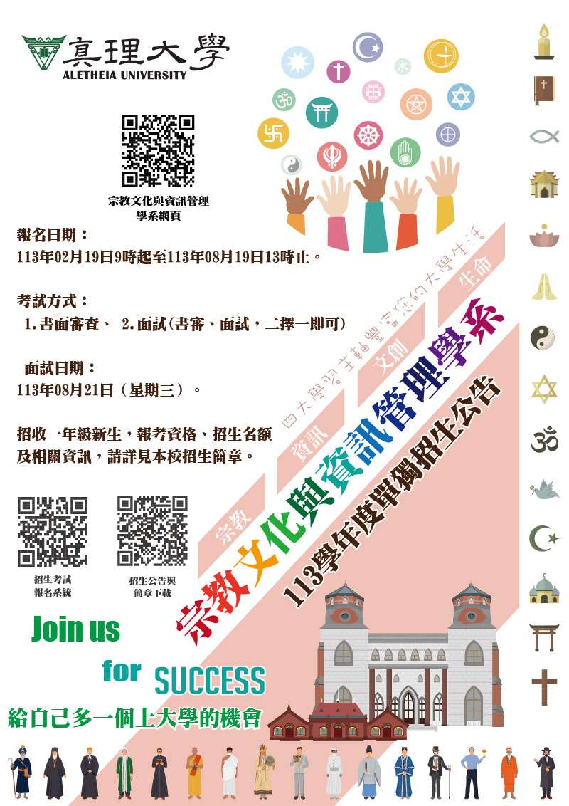 一、本校宗教文化與資訊管理學系辦理單獨招生作業,113學年 度新生已開始報名,至113年08月19日下午1時止。鼓勵有興趣的同學報考。